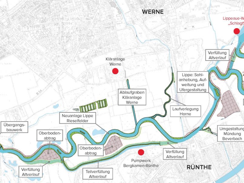 Die ersten Planungen (Abschnitt 1) zur Neugestaltung durch den Lippeverband umfassen das Gebiet zwischen der Rochuskapelle und dem Lippeaue-Wehr „Schlagt“. Dieser Bereich ist aktuell etwa 3,5 Kilometer lang – durch die Laufverlängerung könnte die Lippe hier nach Abschluss der Bauarbeiten 4,7 Kilometer lang sein – also 1.200 Meter länger als bisher! Neue Kurven im Flussverlauf schaffen mehr Auenbereiche an der Lippe, in denen sich das Wasser bei höheren Wasserständen kontrolliert ausbreiten darf. So könnten langfristig Hochwasserspitzen in regelmäßig betroffenen Bereichen abgemildert werden.