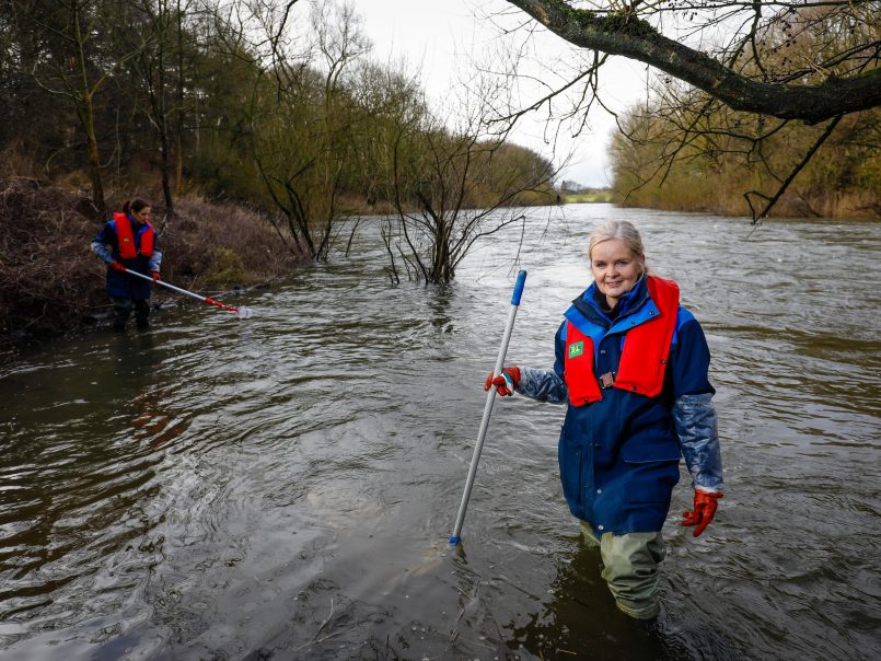 Doch wie funktioniert die biologische Überwachung der Gewässer? Mit einem Kescher „bewaffnet“ nehmen die Biologen je Gewässerabschnitt 20 Teilproben eines mindestens 30 Meter langen Abschnitts. Dies alles erfolgt nach einem genau festgelegten Schema, damit die Proben EU-weit vergleichbar sind – das ist Pflicht. Akribisch werten die Fachleute die Proben anschließend im Labor aus. Mit dem Binokular und Fachliteratur erfolgt die Bestimmung der Arten. Denn der ökologische Zustand eines Flusses wird hauptsächlich über die im Wasser lebenden Organismen definiert. Sie verraten den Experten, in welchem Zustand das Gewässer ist. Auch Parameter wie Temperatur, Sauerstoff und Nährstoffe fließen in die Bewertung mit ein. „Vereinfacht gesagt, schauen wir uns Plankton, Insekten, Fische, aber auch Algen an und bewerten die Zusammensetzung“, erklärt die erfahrene Biologisch-Technische Assistentin.