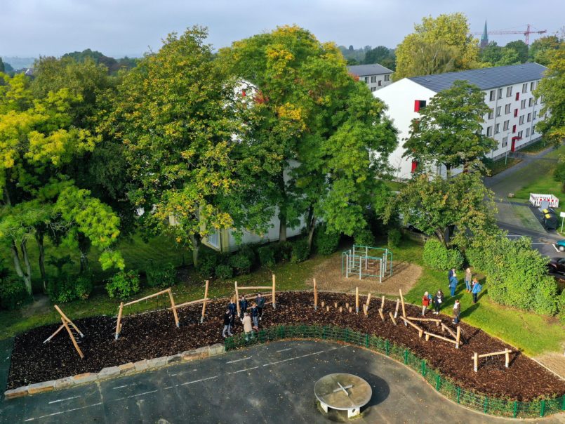Seit Kurzem ist der Bauzaun auf dem Schulhof an der Gemeinschaftsgrundschule Filchnerstraße in Mülheim abgebaut: Entstanden ist dahinter ein naturnahes Areal zum Spielen und Toben mit einem neuen großen Kletter- und Balancierspielgerät. Quadersteine bieten Sitzmöglichkeiten und grenzen genauso wie Hecken den neuen Spielbereich vom rund 3000 Quadratmeter großen Asphalt-Schulhof ab.