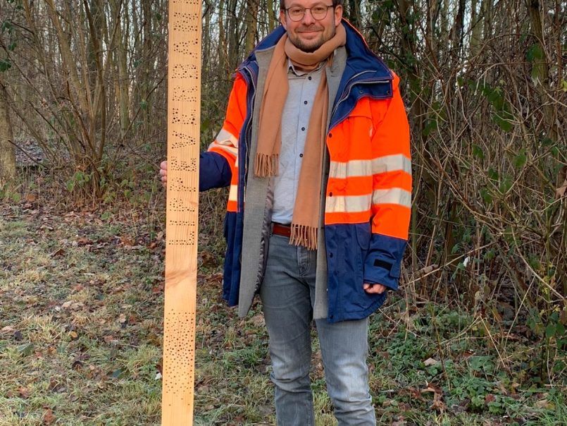 Gebaut hat die etwa zwei Meter hohe Stele André Spatzier. Nach Feierabend hat der Lippeverbands-Mitarbeiter den Bohrer zur Hand genommen und den Bau der Nisthilfe in seiner Freizeit umgesetzt. Zahlreiche Löcher, die unter anderem den Schriftzug „Lippeverband“ ergeben, bieten den geflügelten Insekten bald einen Unterschlupf. Die Tipps seiner Kolleginnen und Kollegen aus dem Imkerverein waren bei der Gestaltung Gold wert.