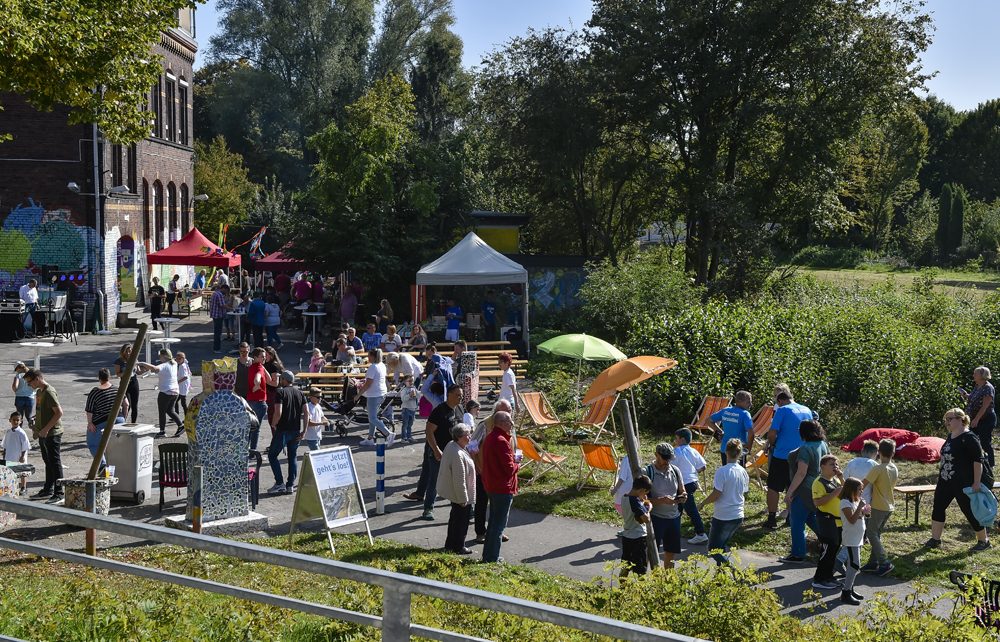 Meilenstein beim Umbau des Katernberger Bachs und damit ein besonderes Ereignis auch für die Menschen vor Ort war der Baustellenstart 2019. Dieser wurde unter großer Beteiligung lokaler Vereine, Institutionen und der Nachbarschaft in einem bunten Familienfest ausgiebig gefeiert. Unter dem Titel „Katernberger Bach – Mach mit! Jetzt geht’s los! Wir feiern den Baustellenstart“ luden viele verschiedene Angebote zum Entdecken und Mitmachen ein. Höhepunkt war das Musik- & Farben-Festival auf dem zukünftigen Bachlauf.