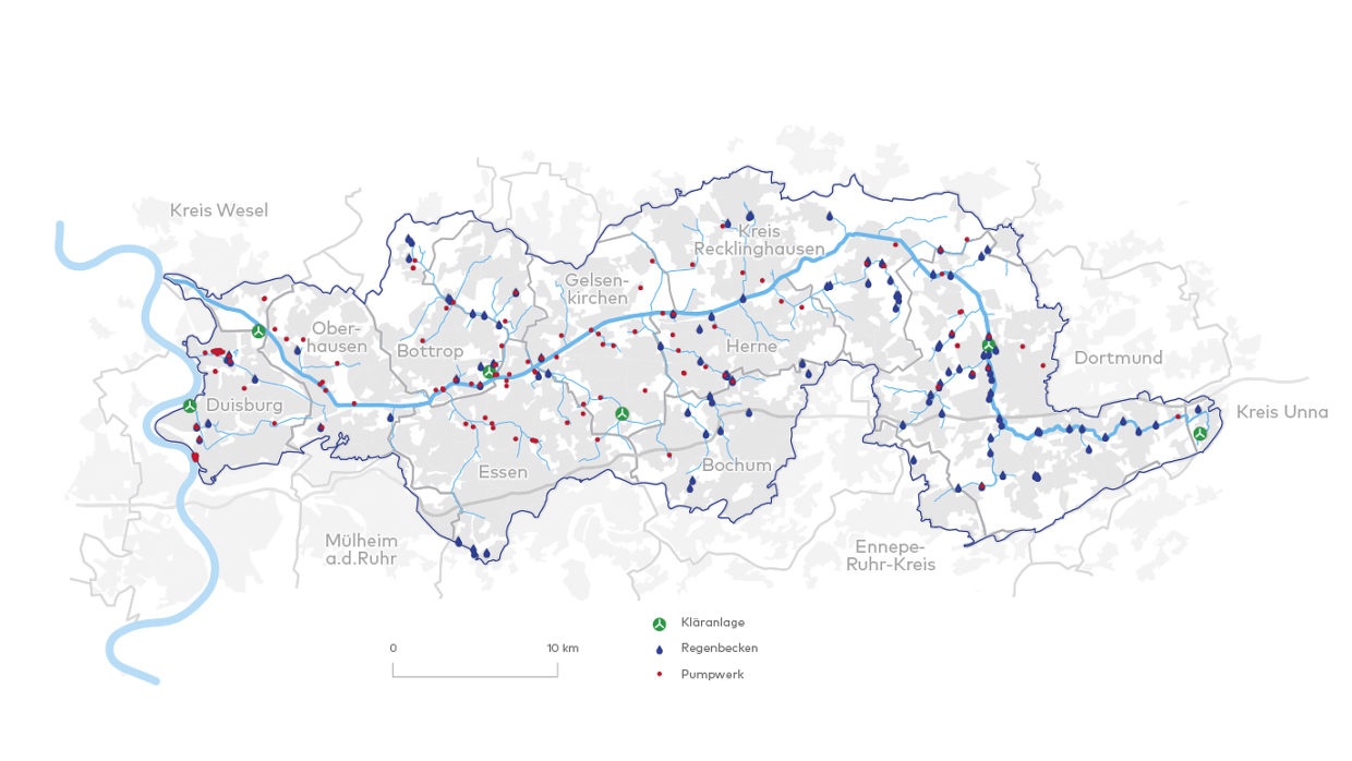 Über ein Kanalsystem (AKE – Abwasserkanal Emscher) im mittlerweile bergsenkungsfreien Revier, wird nun das Abwasser aus Privathaushalten und Gewerbebetrieben parallel zur Emscher unterirdisch geführt. Vier moderne Kläranlagen in Dortmund-Deusen, Bottrop, Duisburg und Dinslaken reihen sich wie an einer Perlenschnur entlang des gesundenden Flusses. Es sind funktionale Meisterwerke der Ingenieurskunst ohne architektonische Dominanz.