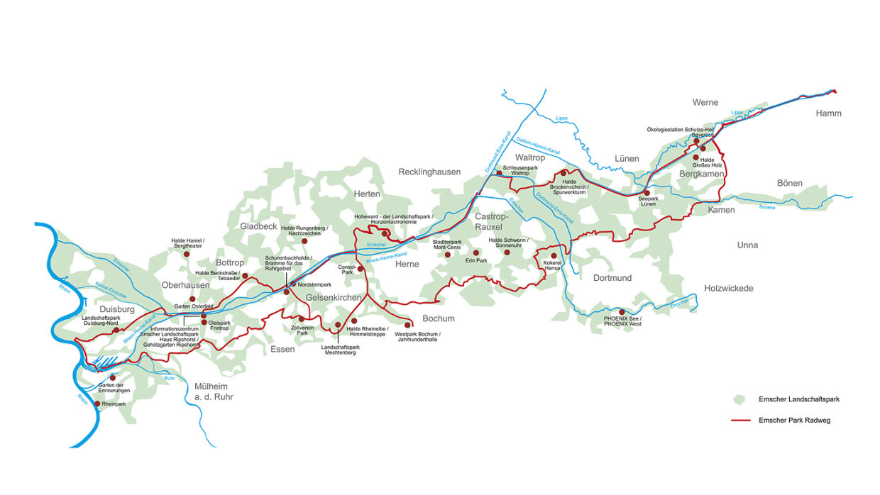 Bei den großen Anstrengungen, die zur Überwindung der Verwerfungen im Rahmen des Strukturwandels im Revier unternommen wurden, spielten neben ökonomischen und kulturellen insbesondere ökologische Aspekte eine zentrale Rolle. Ziel war es, ein Netz von blau-grüner Infrastruktur zu entwickeln, von dem vielfältige positive Effekte für die Region erwartet wurden. Anstelle vom „Emscher Landschaftspark“ (ELP) als bisher geläufigem räumlichen Entwicklungsbegriff sprechen die regionalen Akteure inzwischen von der „Grünen Stadtlandschaft“. Der Dreiklang, die Versöhnung von Ökologie, Ökonomie und Sozialem, soll dabei erhalten bleiben.