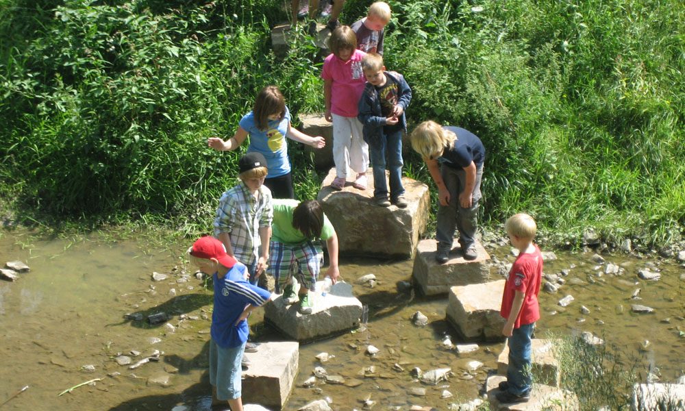„Am Hahnenbach, am Hahnenbach da ist es einfach sagenhaft. Die Vögel singen, die Blumen blühen, unsre „Brauckerwelt“ wird immer wieder grün. Fröhlich hören wir dort unsere „Marienkinder“ singen, am blauen Klassenzimmer sind wir beim FORSCHEN stets zu finden. Frösche-Laich-Würmer und Larven kleine Forscher erspüren alles beim Graben.“