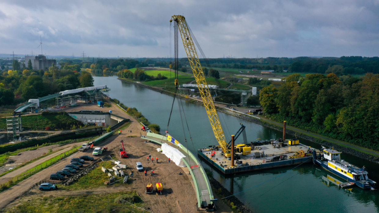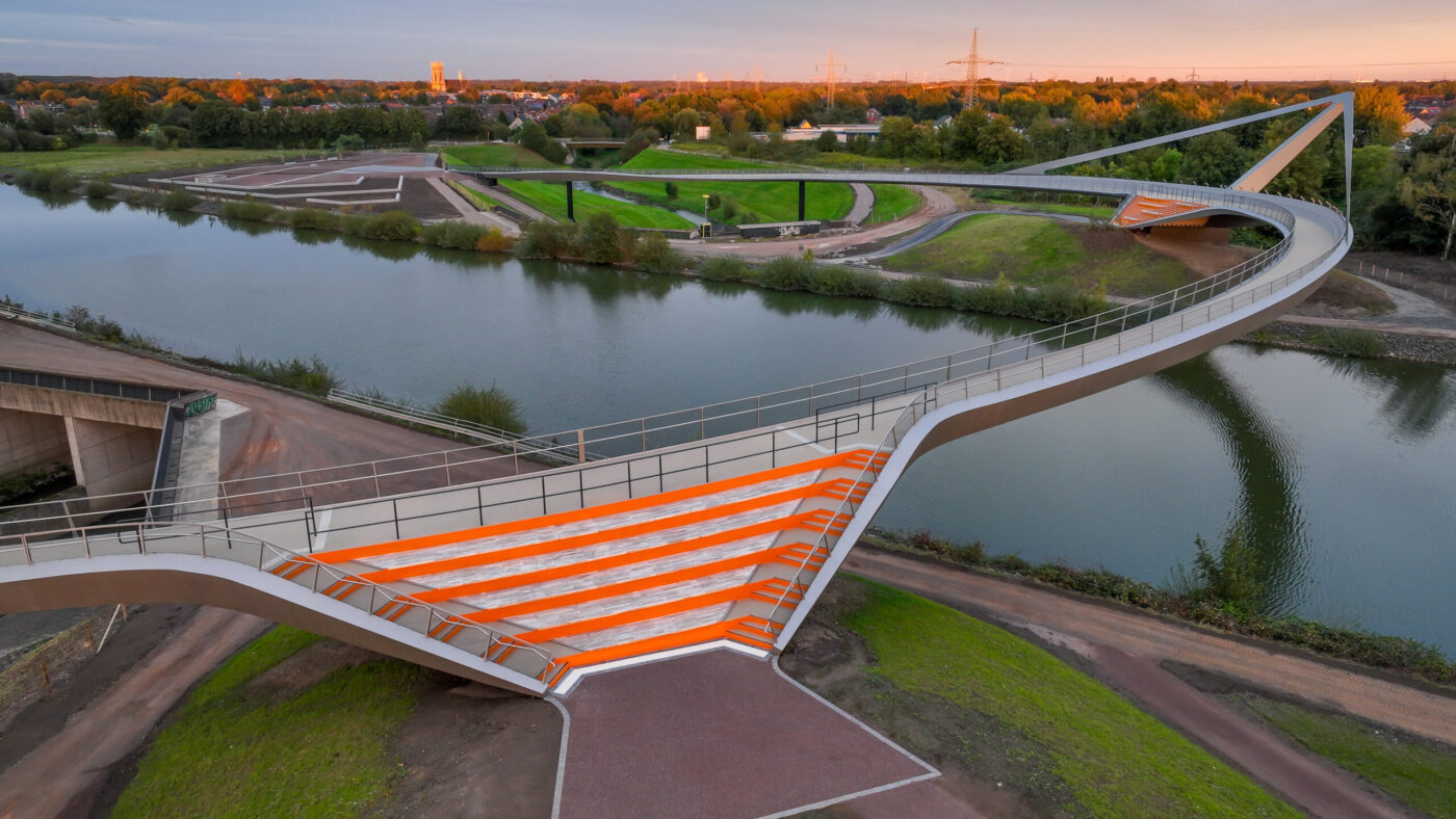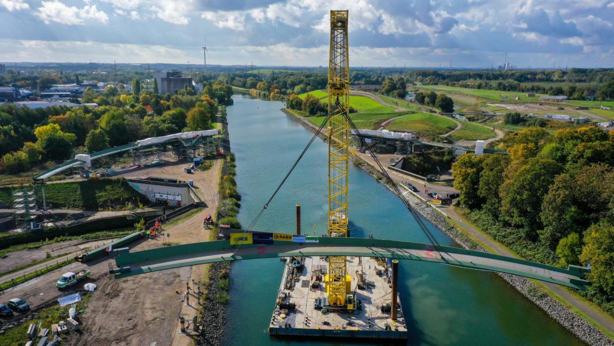 Sie hat eine einzigartige Optik – und damit das Potenzial, zu einem der beliebtesten Fotomotive der Region zu werden: der „Sprung über die Emscher“. Der Baustart für die spektakuläre Brücke über den Rhein-Herne-Kanal und die Emscher erfolgte im April 2021. Der Architekturentwurf stammt von Planungsgemein­schaft Schüßler-Plan Ingenieurgesellschaft aus Düsseldorf, DKFS aus London und Smeets Landschaftsarchitekten, Erftstadt.