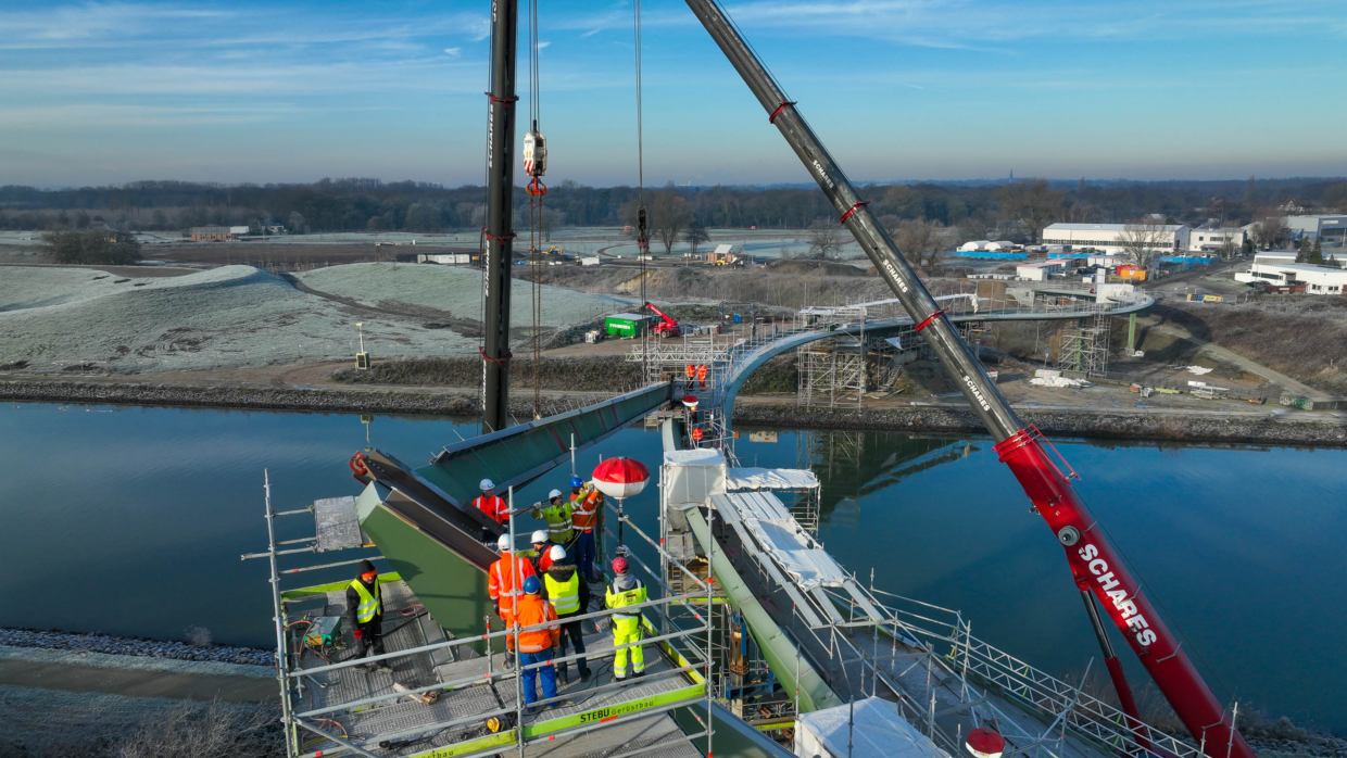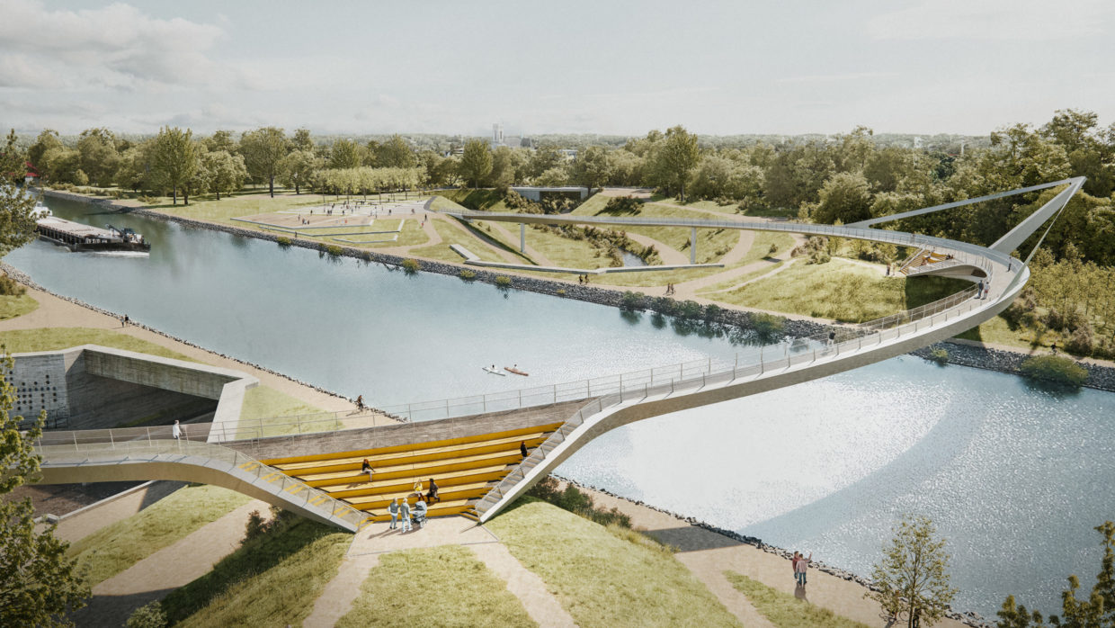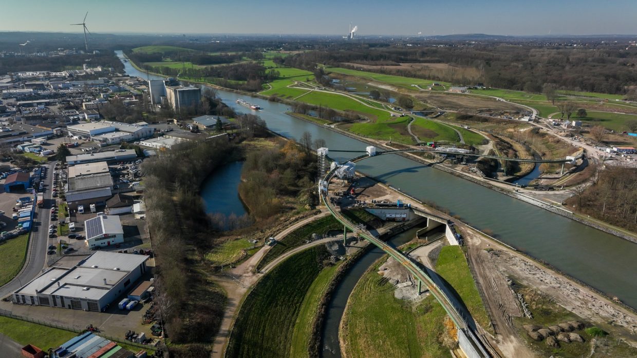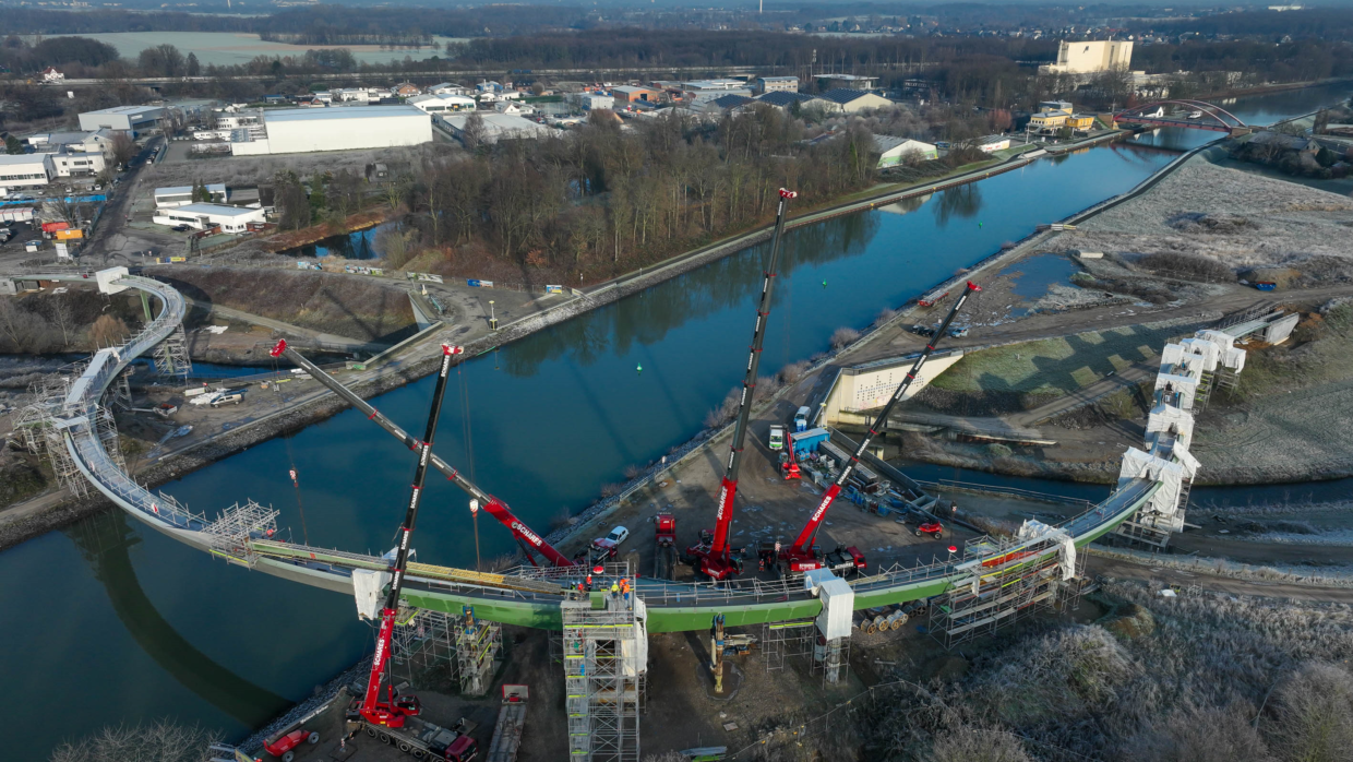 Sie hat eine einzigartige Optik – und damit das Potenzial, zu einem der beliebtesten Fotomotive der Region zu werden: der „Sprung über die Emscher“. Der Baustart für die spektakuläre Brücke über den Rhein-Herne-Kanal und die Emscher erfolgte im April 2021. Der Architekturentwurf stammt von Planungsgemein­schaft Schüßler-Plan Ingenieurgesellschaft aus Düsseldorf, DKFS aus London und Smeets Landschaftsarchitekten, Erftstadt.