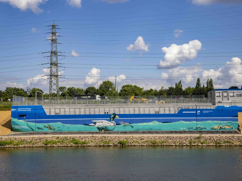 Baubeginn für das Becken war im Januar 2020. Nach der Fertigstellung im Dezember 2021 sollte das Gebäude wie schon an anderen Gebäuden im Emscher-Lippe-Gebiet mit einem Graffiti verschönert werden. In den vergangenen Wochen wurde nun die rund 370 Quadratmeter große Wandfläche farbenfroh angemalt. Von der Seite des Rhein-Herne-Kanals aus sticht das „Emscher-Schiff“ nun deutlich sichtbar hervor. Das Ergebnis kann sich mehr als sehen lassen und bereichert das Emscher-Gebiet um einen weiteren Hingucker im Rahmen des Emscher-Umbaus.