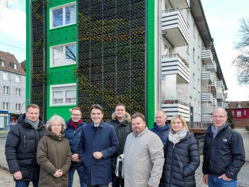 Wo vorher eine kahle Hauswand war, schmückt seit Kurzem ein grüner Teppich mit 2377 einzelnen Pflanzen die Fassade des Wohnhauses an der Kurt-Schumacher-Straße. Das Grün ist aber nicht nur ein ästhetischer Blickfang, es hat auch einen ganz konkreten Nutzen für das Mikroklima vor Ort: Die rund 90 Quadratmeter große vertikale Vegetation sorgt über die Verdunstung ihrer Blätter für eine Kühlung der Umgebung und bindet Feinstaub. An einer der am stärksten befahrenen Straßen in Gelsenkirchen ist das ein positiver Effekt mit Vorbildcharakter.
