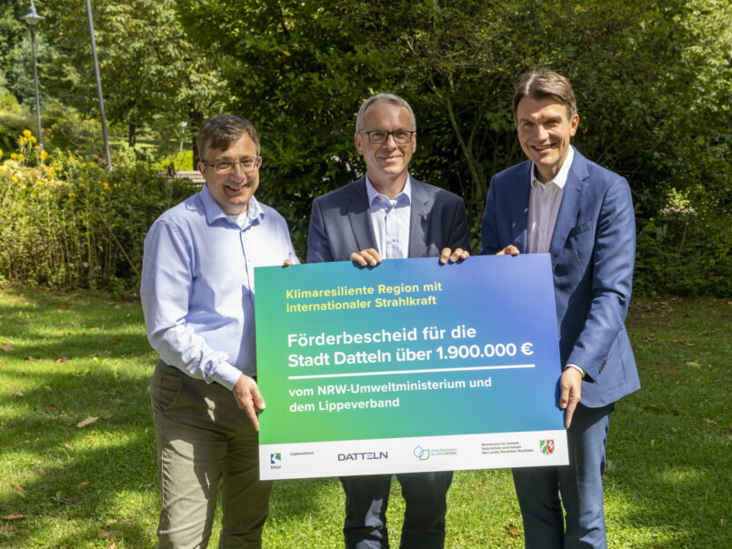 „Das Projekt zeigt anschaulich, wie das Schwammstadt-Prinzip und eine naturnahe Regenwasserbewirtschaftung umgesetzt werden können“, sagte Prof. Dr. Uli Paetzel. „Es ist mir daher eine große Freude, den Förderbescheid in Höhe von 1,9 Millionen Euro zu übergeben.“ Rund 1,1 Millionen Euro davon fördert das NRW-Umweltministerium aus dem Förderprogramm „Klimaresiliente Region mit internationaler Strahlkraft“, der Lippeverband stockt mit rund 754.000 Euro auf den Gesamtbetrag auf, so dass die Stadt Datteln eine hundertprozentige Förderung für alle Baumaßnahmen rund um die Regenwasserbewirtschaftung am Rathaus erhält.