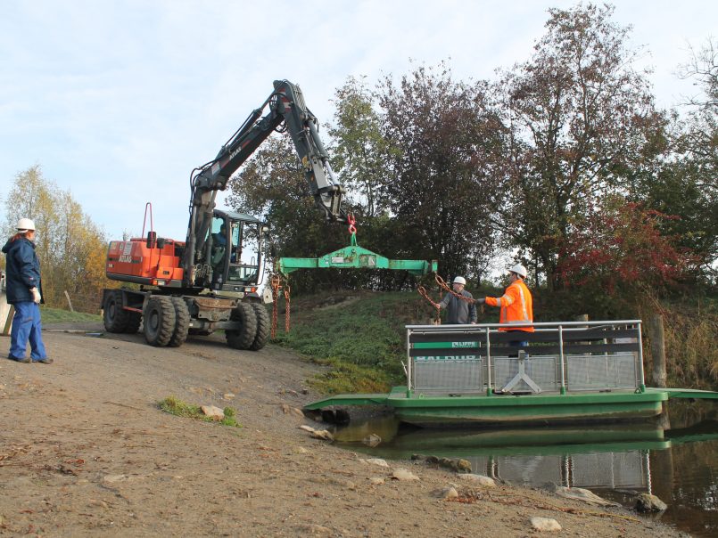 Dorsten. Die Tage sind bereits kürzer, die Bäume verlieren ihr Laub: Zeit für Gewässermeisterin Ina Bernds und ihr Team die Fähre Baldur ins Winterquartier zu bringen. Am Dienstag, 29. Oktober, nimmt das Team des Lippeverbandes die Fähre an den Baggerhaken und bringt sie an Land. Dann stehen Wartung und Pflege des zwei Tonnen schweren Lippe-Kreuzers an.
