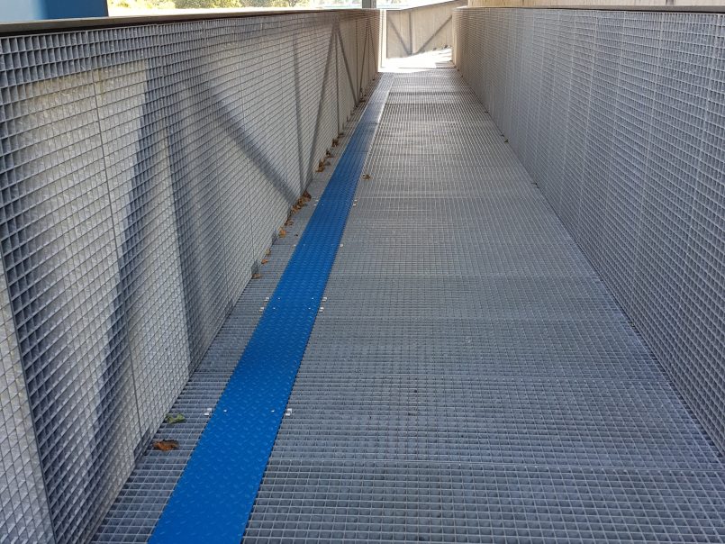 Dinslaken. „Laufsteg frei“ für Hunde auf der Brückenunterquerung der Brinkstraße (B8) in Dinslaken. Der neu montierte, emscherblaue Laufstreifen aus sogenanntem Tränenblech macht den Brückensteg ab sofort „pfotenfreundlich“.