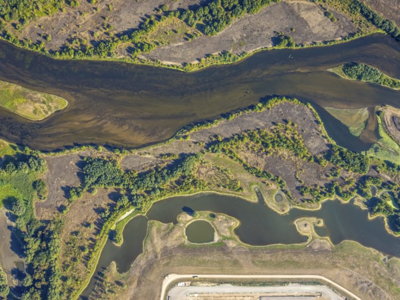 Das erste Foto nach Ende der Baumaßnahme zeigt reinen Sandboden im neuen Auengebiet – es scheint mehr Wüste als blaugrüne Oase zu sein. Dies ist so gewollt, damit naturtypische Auenbegrünung und eigendynamische Gewässerentwicklung beste Startmöglichkeiten haben. Zwei Jahre nach dem Umbau sind erste Veränderungen sichtbar, erste Pflanzen und Tiere zeigen sich, die wichtige Pioniere der Auenentwicklung sind. Weitere Entwicklungsschritte folgen. Auf dem Foto von 2022 ist zu sehen, wie sich mittlerweile größere Bäume mit weiterhin offenen Sand-Kies-Fluren abwechseln. Der Fluss hat sich eigendynamisch verändert, hat die Flusssohle umgeformt und Auentümpel gebaut, in denen sich bereits Muscheln und Frösche tummeln. Wasserorganismen und -pflanzen haben sich ausgebreitet und bilden in der Nahrungskette die Grundlage für die Ansiedlung größerer Arten.