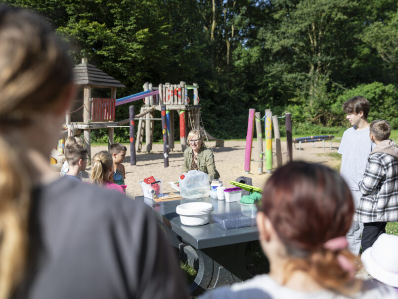 Unterricht mitten in der Natur: Dank Sitz- und Arbeitsmöglichkeiten in der Aue können Kinder, Jugendliche und Erwachsene in der Nähe der Glückauf-Sporthalle an der Hasseler Straße in Herten-Bertlich zukünftig ihre Umgebung erforschen – und vorher diese selbst gestalten. Bevor es in der Kreativwerkstatt ans Basteln und Diskutieren ging, nahmen die Teilnehmenden den zukünftigen Ort für ihr Blaugrünes Klassenzimmer genauer unter die Lupe: Mit Pinseln und Becherlupen untersuchten die großen und kleinen Forscher*innen erste Insekten und probierten bei Wasserexperimenten zum Beispiel mit Holz oder Steinen aus, welches Material auf Wasser schwimmt. Der kurze Ausflug gab nicht nur einen Vorgeschmack auf die Aktivitäten, die die zukünftigen Nutzer*innen bald am Freiluftlernort erwarten, sondern auch viel Inspiration für das anschließende Basteln der Wunsch-Klassenzimmer.