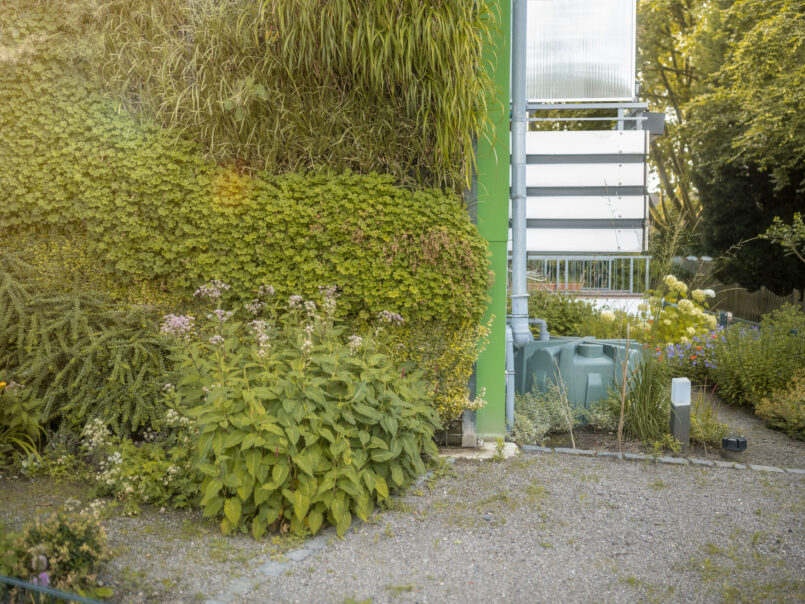 Fassade begrünen, Garagenauffahrt entsiegeln, Mulde bauen