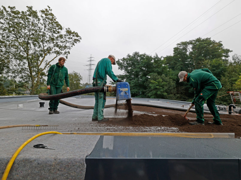 Das bedeutet: Auf der Dachkonstruktion wird eine pflegeleichte Vegetationsschicht mit Sedum-Pflanzen (Dickblattgewächsen) aufgebracht. Nun ist das Substrat auf der Fläche verteilt worden, in dem die Pflanzen anwachsen sollen – im Frühjahr 2022 wird es dann grünen und blühen, werden Insekten und Bienen hier Nahrung finden. Das Biotop auf der Lagerhalle soll in dem hitzebelasteten Bereich, in dem der Gasometer liegt (Gewerbe- und Industrieklima), eine wichtige Funktion erfüllen: Die Dachbegrünung bewirkt durch den Rückhalt von Regenwasser eine Reduzierung des Abflusses der Niederschläge in die Kanalisation und über Verdunstung eine Kühlung des Umfeldes.