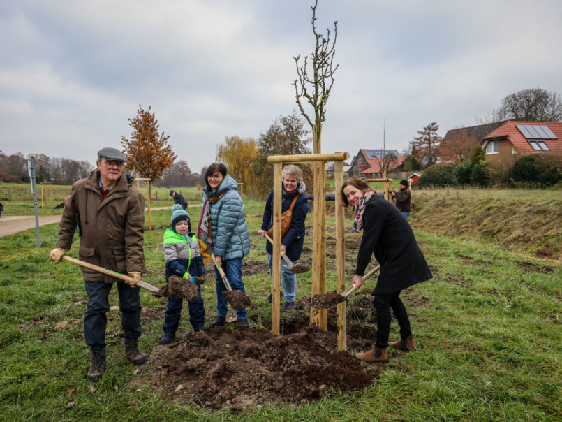 Zwölf hochstämmige Obstbäume – ein Mix aus Apfel, Birne, Kirsche und Zwetschge – stehen nun auf einer zirka 2.200 Quadratmeter großen Fläche des Lippeverbandes am Heerener Mühlbach (in der Nähe der Bergstraße). Den Anstoß für die Pflanzaktion gaben Anwohnerinnen und Anwohner, die auf den Lippeverband mit der Bitte um Anlegung einer Streuobstwiese zugegangen sind. „So viel Engagement der Bürgerinnen und Bürger für unsere Stadt finde ich wunderbar. Als Stadt Kamen unterstützen wir die Aktion gerne“, erklärt Bürgermeisterin Elke Kappen. Die Stadt hat die Obstbäume beschafft und wird für die nächsten drei Jahre zusammen mit den Quartiersbewohner*innen die Entwicklungspflege der Bäume übernehmen. Danach soll die Pflege von den Ehrenamtlichen übernommen werden.