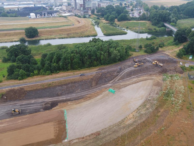 Noch in dieser Woche beginnt der Rückbau des Alt‐Deiches. Das ausgebaute Deichmaterial lagert der Lippeverband in unmittelbarer Nähe zwischen, um es bei sich ändernden Wasserständen nutzen zu können. Zum Aufbau des neuen Deichanschluss-stücks gehören unter anderem die Einbringung des Deichkörpermaterials, der Dränschicht und der Dichtung.
