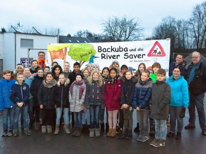 Am Backumer Bach in Herten haben sich im Rahmen der Kooperation die SchülerInnen des städtischen Gymnasiums Herten auf den Weg gemacht sich als „Riversaver“ aktiv am ökologischen Umbau der einstigen Köttelbecke zu beteiligen und den Prozess über Jahre zu begleiten. Dabei werden die Schüler*innen selbst zu Mitgestaltern ihrer Umwelt. Die tristen Bauzäune wurden mit historischen Einblicken aber auch Visionen vom neuen Bach gestaltet und viele weitere Ideen sind schon in Planung. Immer mit dabei: das Maskottchen „Backuba“, ein Eisvogel der vielleicht schon bald am ökologisch umgestalteten Backumer Bach ein neues Zuhause findet. Fächerübergreifend werden die SchülerInnen dabei von ihren Lehrer*innen unterstützt und erhalten durch die Partnerschaft zur Emschergenossenschaft hautnah Einblick in die Transformation der Gewässerlandschaft vor ihrer Haustür.