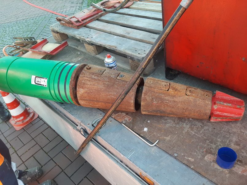 „Beim TIP-Verfahren wird ein tragfähiges Kunststoffrohr in das vorhandene Altrohr eingepresst. Durch einen am Beginn des Rohrstrangs angebrachten Stahlkörper pressen wir das verformte Altrohr in die ursprüngliche Form zurück – das funktioniert nicht bei jeder Baustelle, hier war es aber problemlos möglich“, erklärt Projektleiter Andreas Langenberg. Der Einbau der Rohre fand über die vorhandenen Schächte statt. Eine im Schacht installierte Hydraulikpresse schob dabei die rund 50 cm langen Rohrmodule in das Altrohr ein. Innerhalb von vier Stunden konnte so eine Strecke von knapp 50 Metern erneuert werden.
