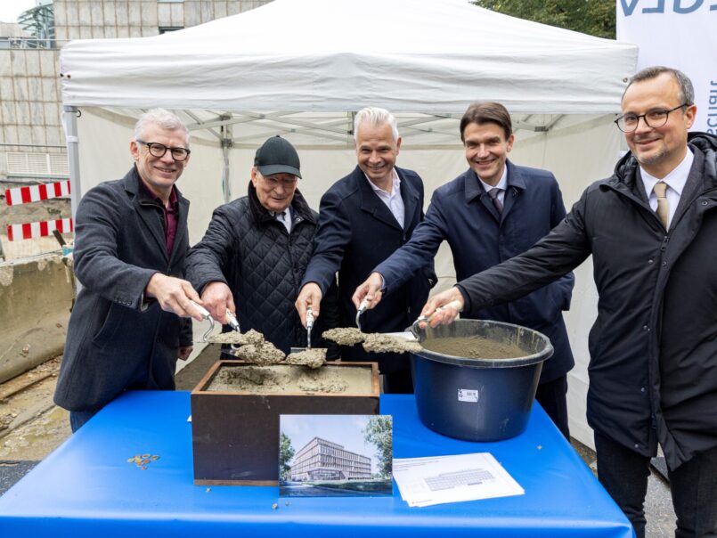 Essen. Zwischen 1908 und 1910 entstand im Essener Südviertel das imposante Emscher-Haus. In den vergangenen 114 Jahren wuchs die Hauptverwaltung der Emschergenossenschaft, die in diesem Jahr ihr 125-jähriges Bestehen feiert, mit der Anzahl der Beschäftigten. Während die Erweiterungsanbauten dem jeweiligen Zeitgeist entsprachen, bietet die beeindruckende Architektur des Altbaus einen zeitlosen Anblick an der Ecke Kronprinzenstraße/Richard-Wagner-Straße. Heute – 114 Jahre nach Eröffnung des Verwaltungsgebäudes – entsteht auf der anderen Seite zum Bernewäldchen hin ein weiterer Anbau, der das Emscher-Karree komplettiert: Gemeinsam mit Martin Harter, Beigeordneter für Stadtplanung und Bauen bei der Stadt Essen, erfolgte nun die Grundsteinlegung – inklusive einer „Zeitkapsel“, u.a. mit einer aktuellen Tageszeitung (Essener Ausgabe der WAZ).