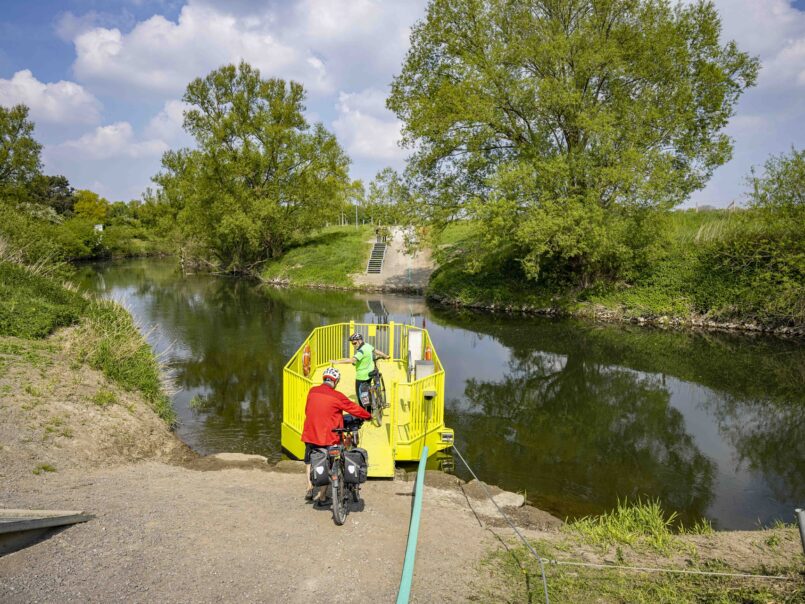 Die Lippe-Fähren Baldur und Maifisch bringen seit 2005 in Dorsten und seit 2015 in Haltern am See im Stadtteil Flaesheim Ausflügler*innen mit und ohne Fahrrad trockenen Fußes über die Lippe. Das Besondere: Die Fähren werden allein mit Muskelkraft betrieben, indem sich die Passagier*innen an einem Seil zum anderen Lippe-Ufer kurbeln oder ziehen.