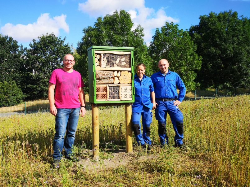 Angemalt in leuchtendem Grün, der Hausfarbe des Lippeverbandes, steht das Hotel fertig zum Einzug auf der anliegenden Wildblumenwiese parat. Die hatte das Team in diesem Jahr am Betriebshof eingesät. So ist ein ökologisch wertvoller Lebensraum für Insekten und Wildtiere entstanden, der durch das selbstgemachte Insektenhotel nun optimal ergänzt wird.