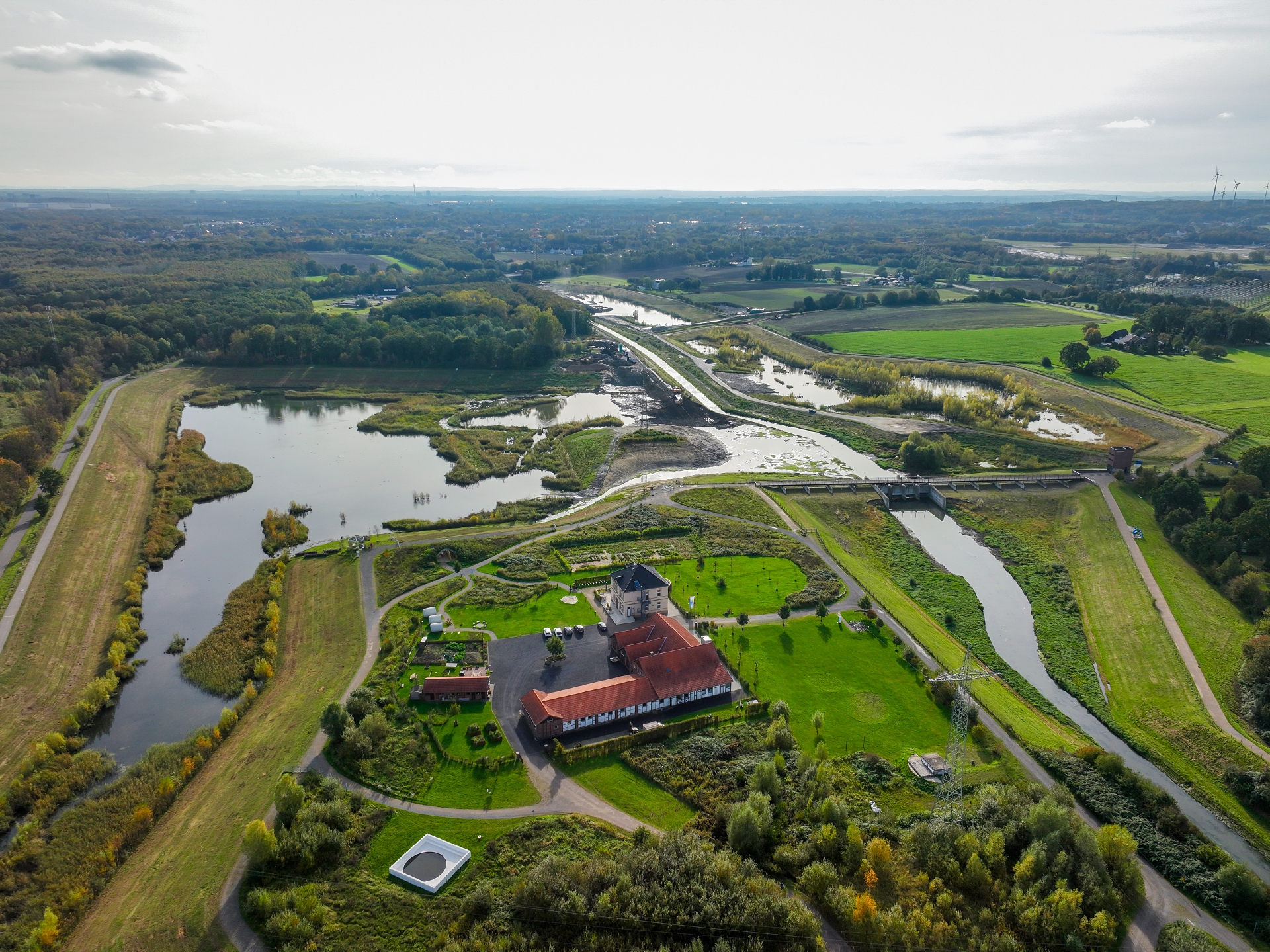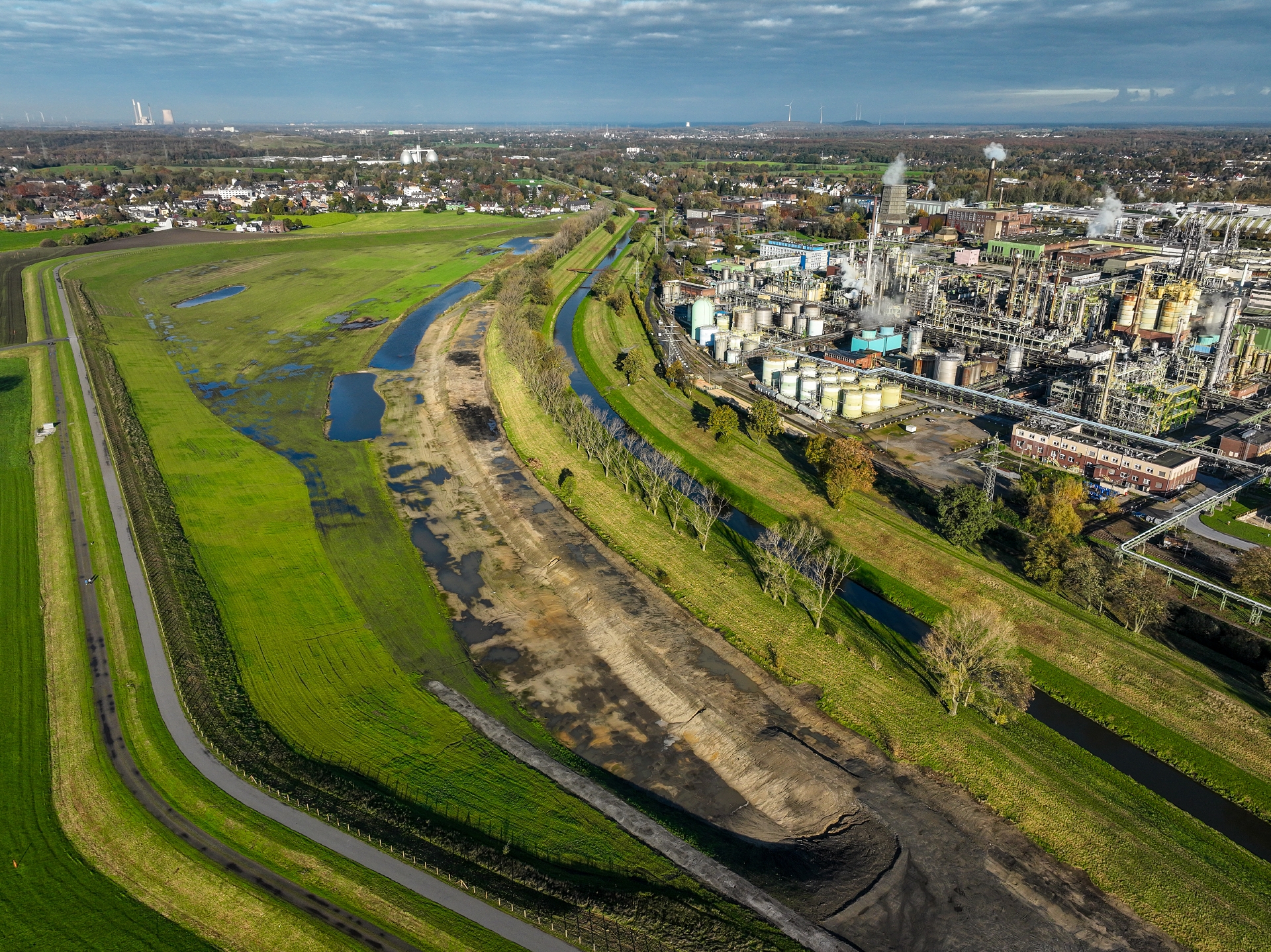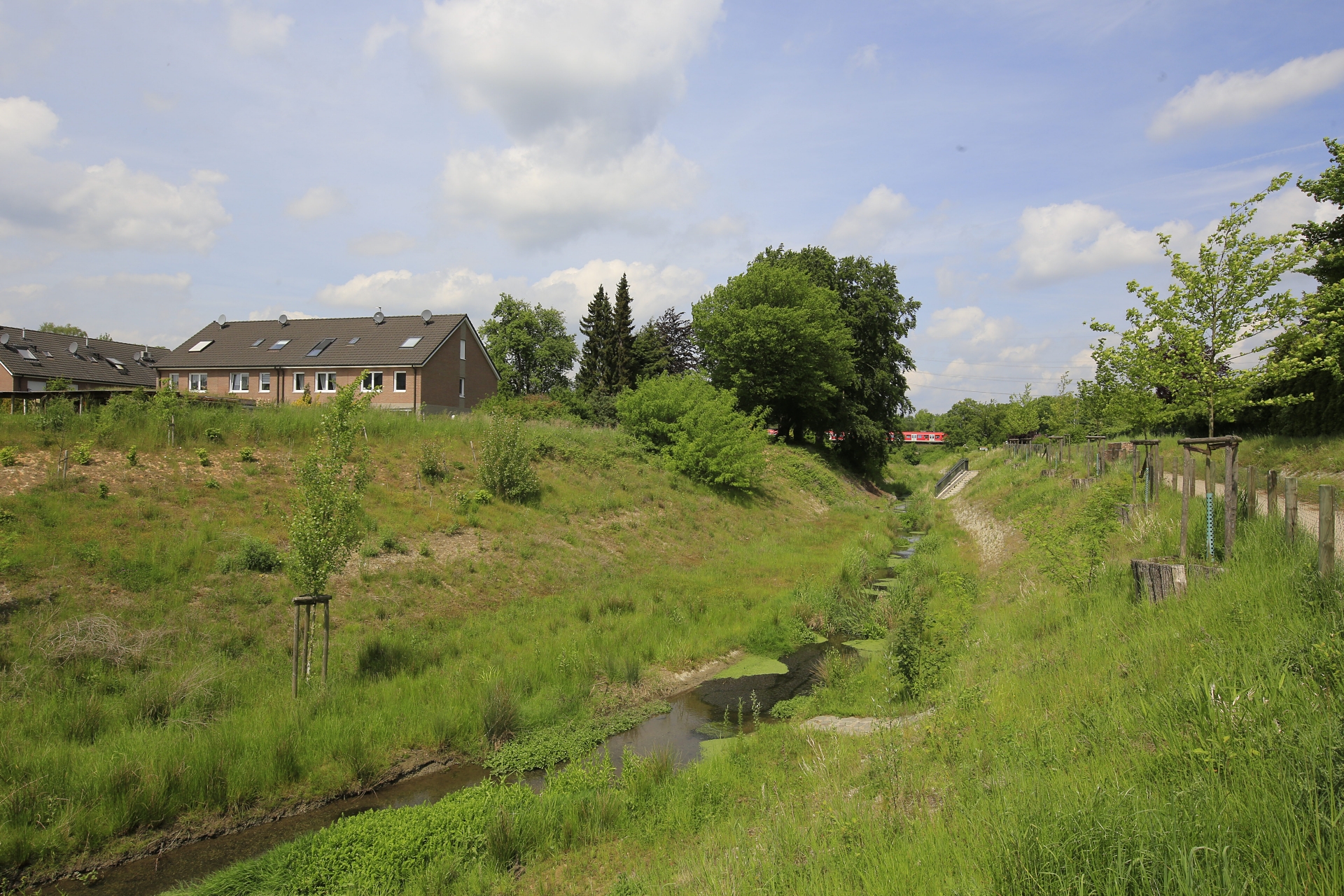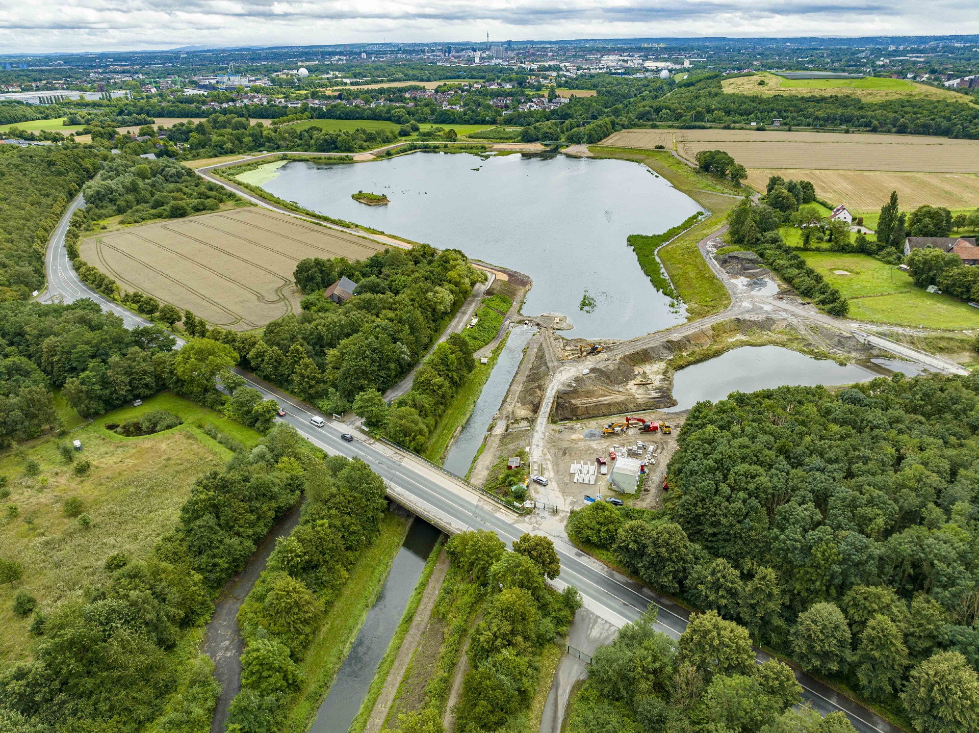 Das Hochwasserrückhaltebecken Dortmund-Ellinghausen im gefüllten Zustand – hier wird der Nutzen der Anlage für die Bevölkerung deutlich: Das Becken hält Wassermassen zurück, die sonst unter Umständen zu Überflutungen führen könnten.