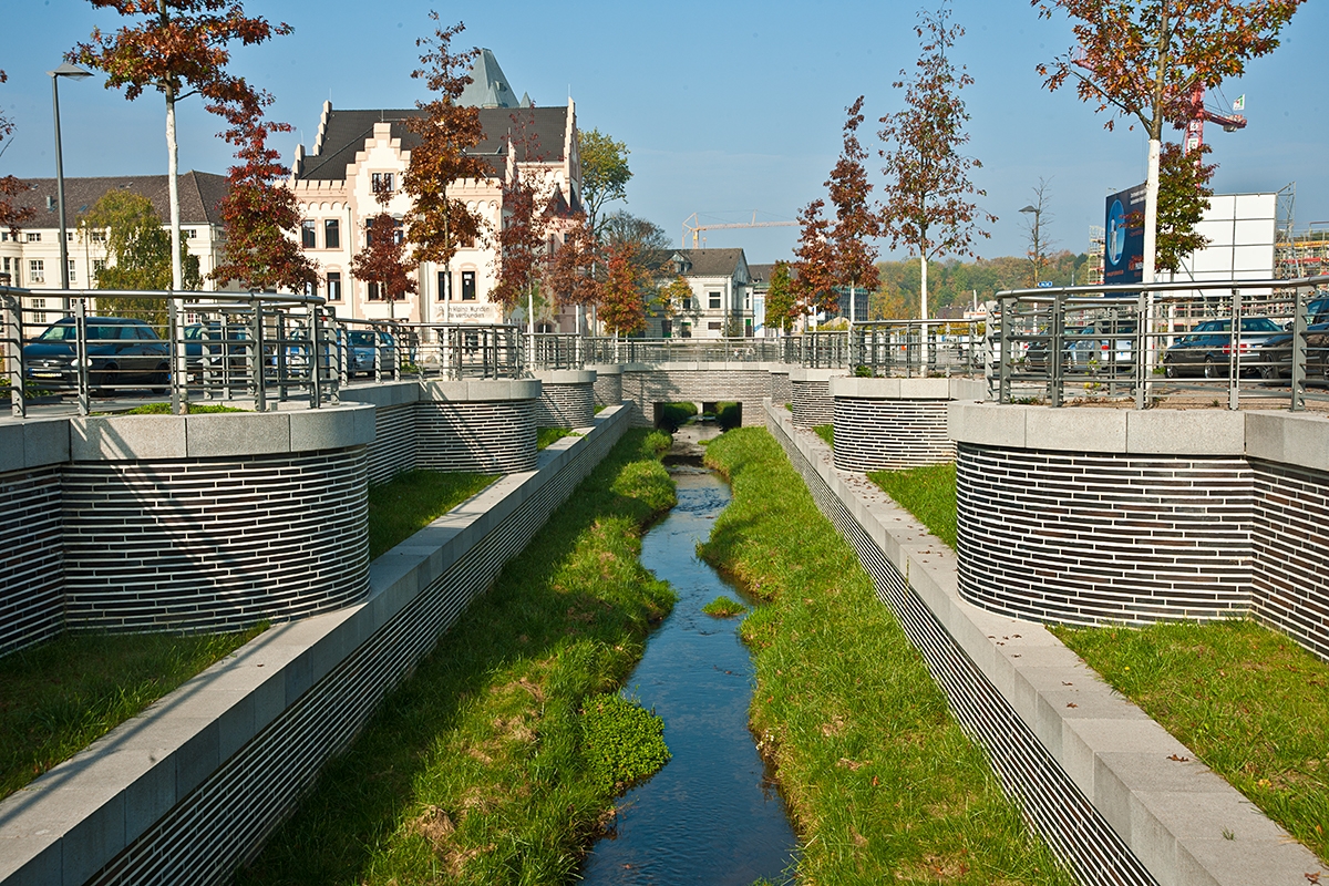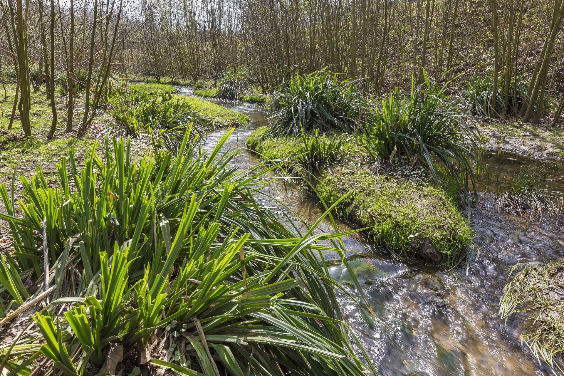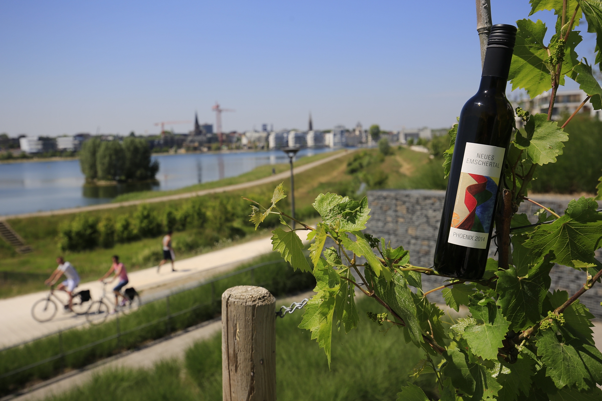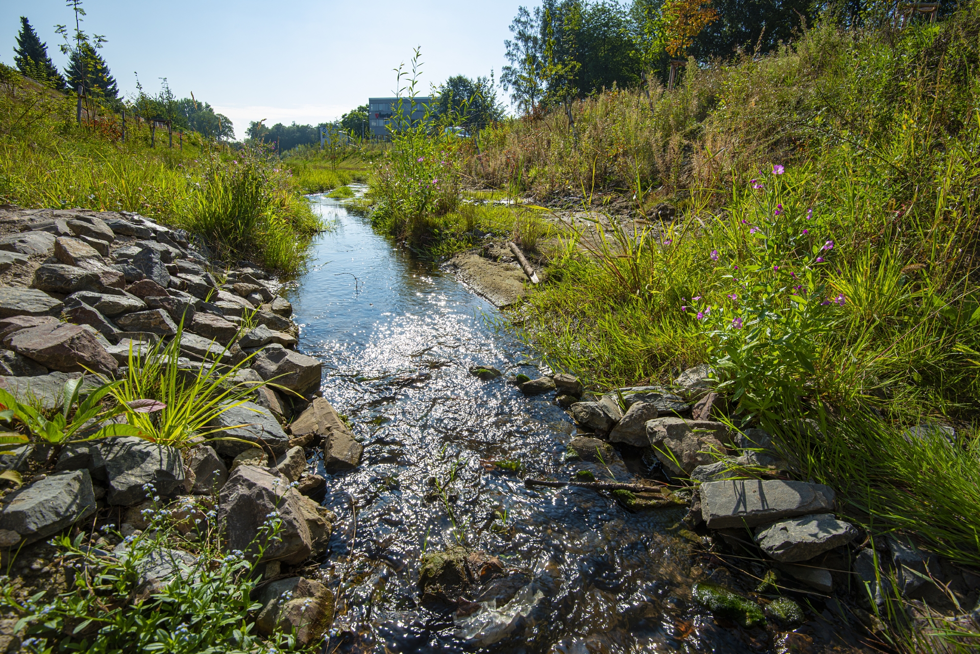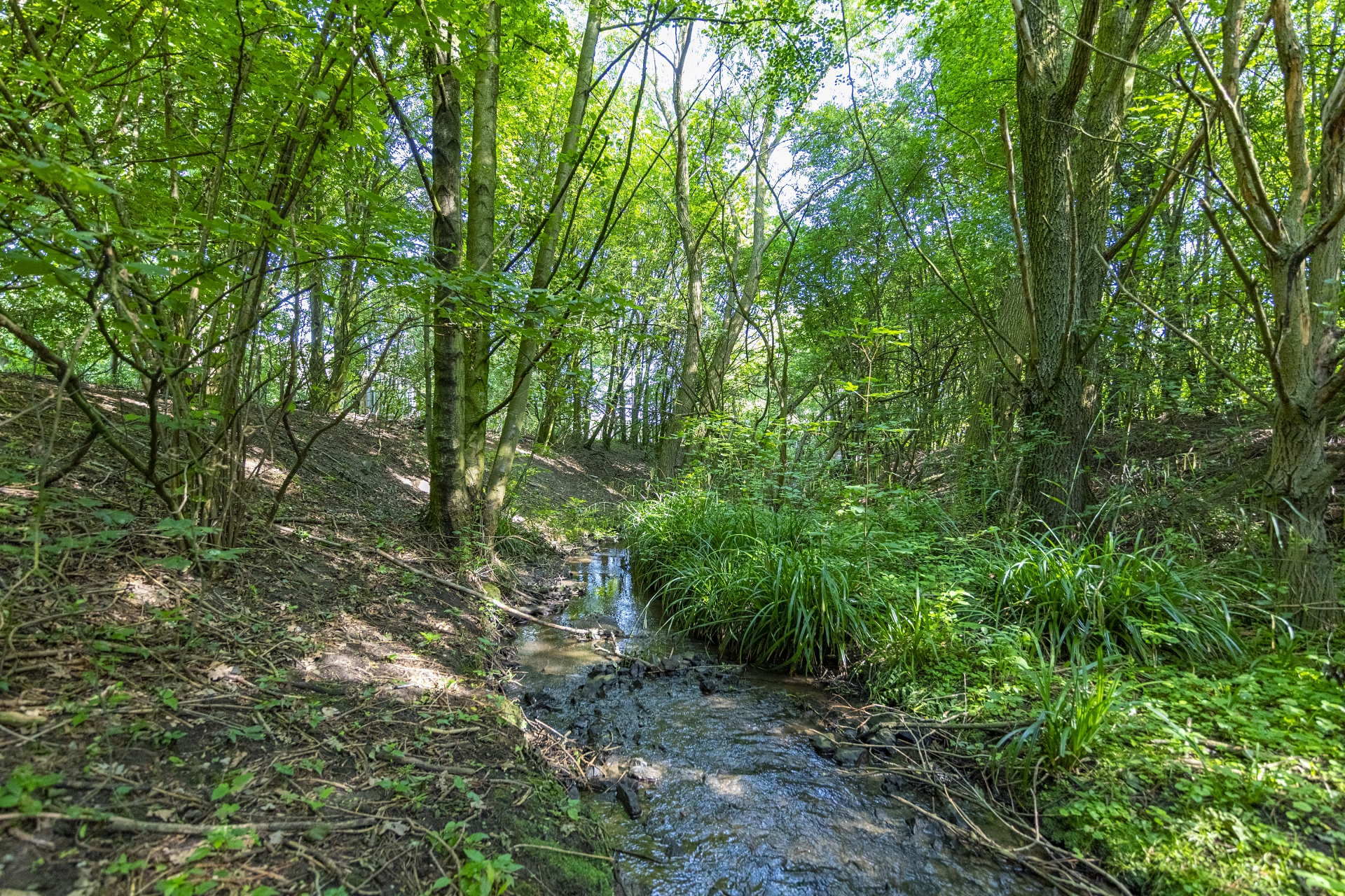 Das Hochwasserrückhaltebecken Dortmund-Ellinghausen im gefüllten Zustand – hier wird der Nutzen der Anlage für die Bevölkerung deutlich: Das Becken hält Wassermassen zurück, die sonst unter Umständen zu Überflutungen führen könnten.