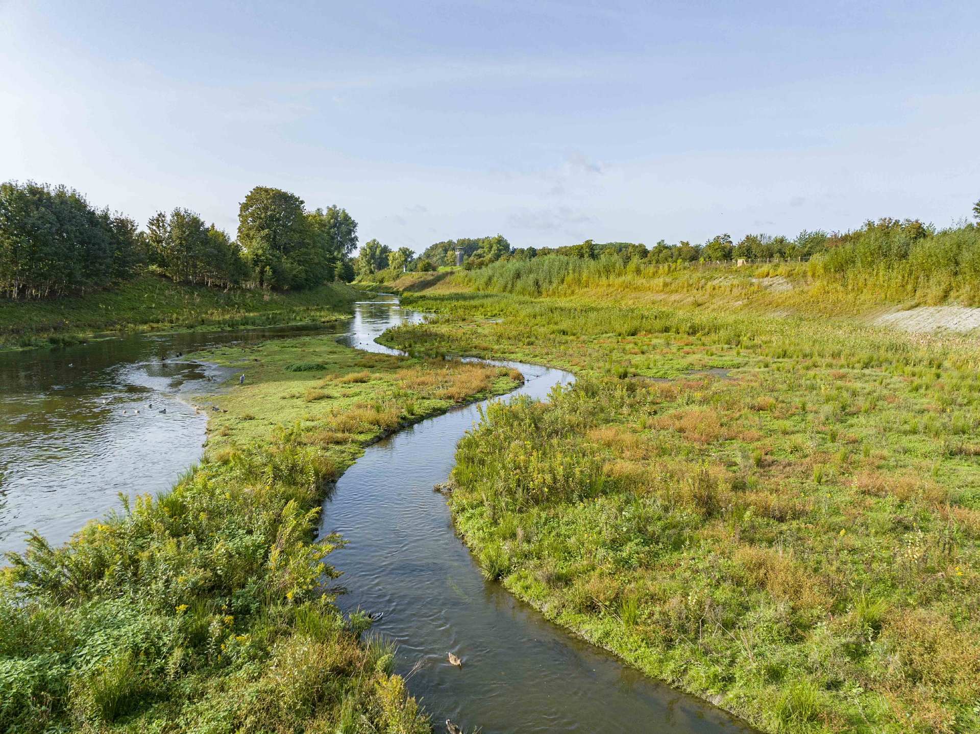 Der Suderwicher Bach, einst ein mit grauen Betonsohlschalen ausgekleideter offener Schmutzwasserlauf, ist mittlerweile renaturiert worden. Sein neuer Lauf (mi.) mündet in Recklinghausen in die ebenfalls renaturierte Emscher (li. und hinten).