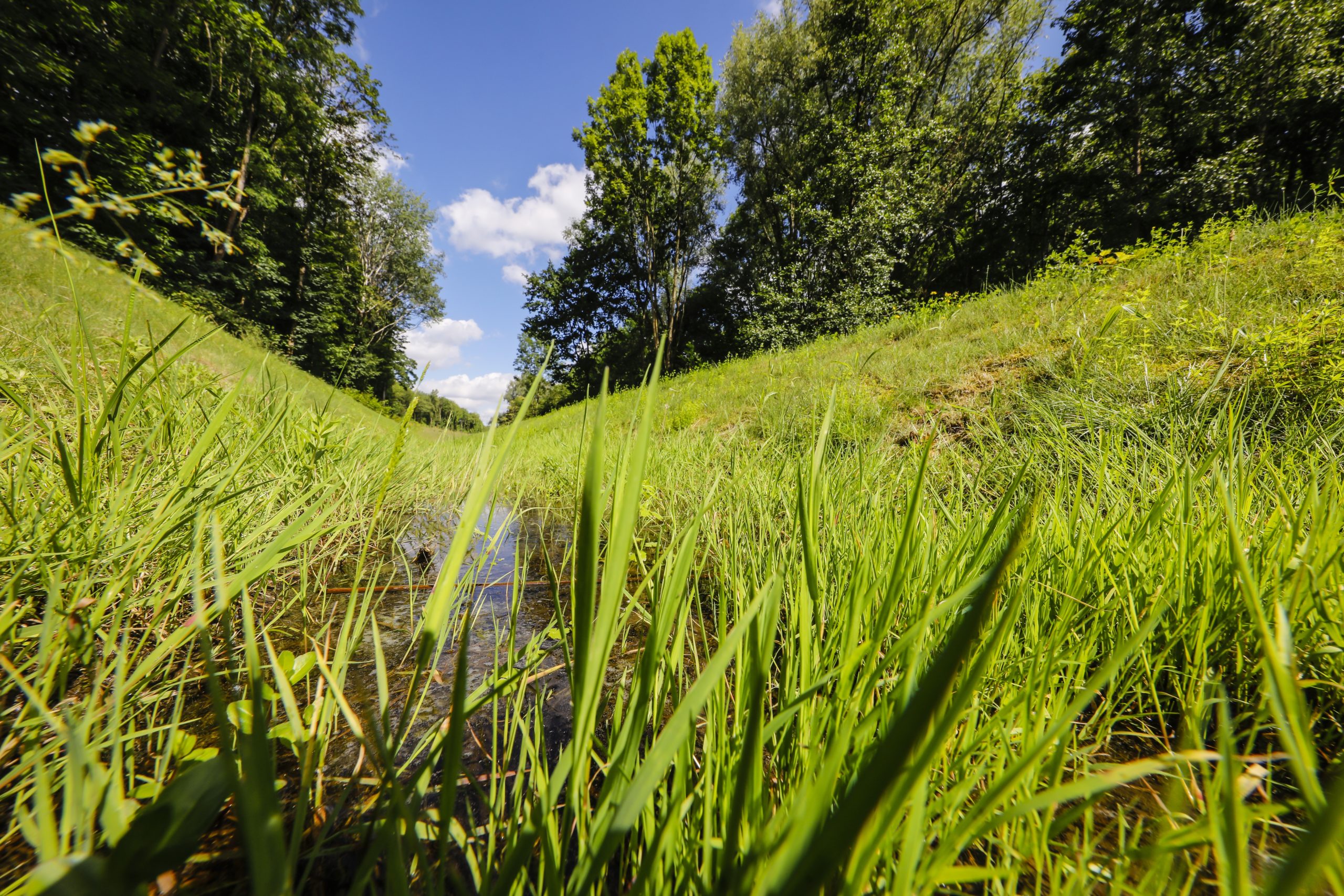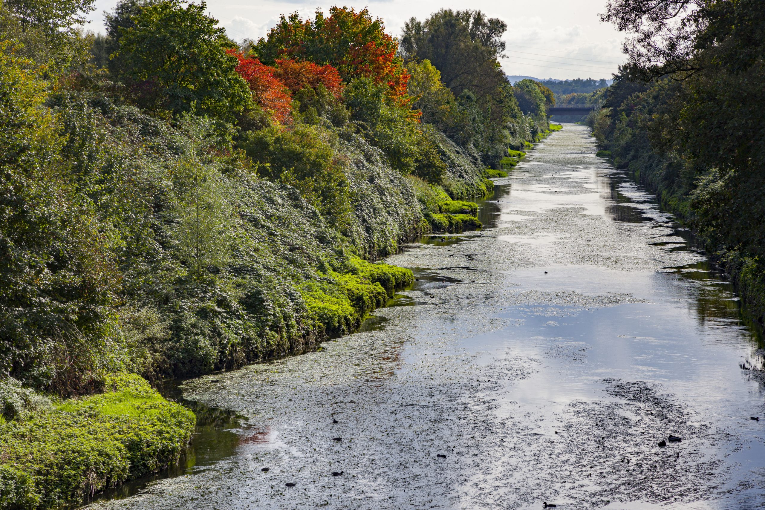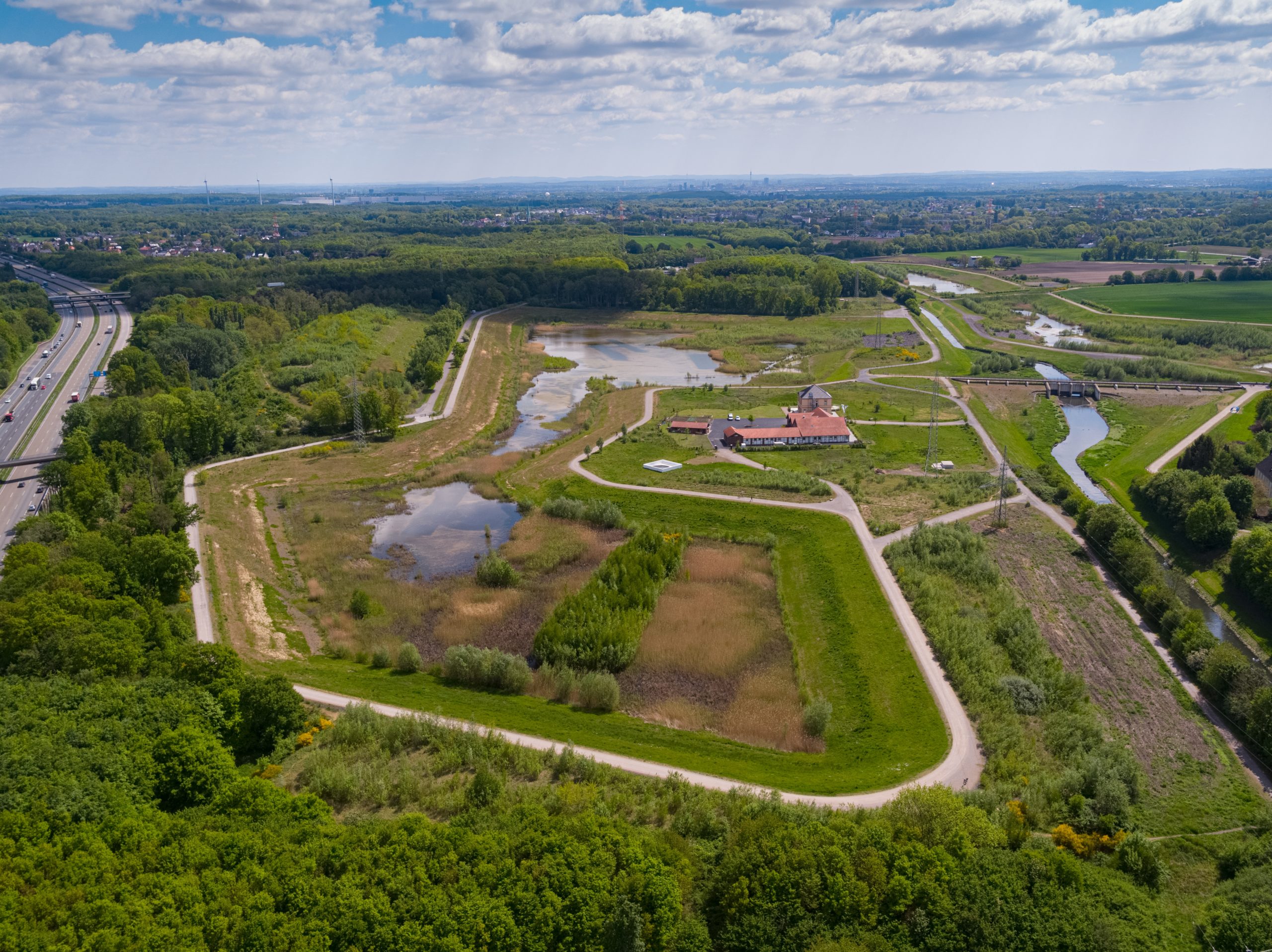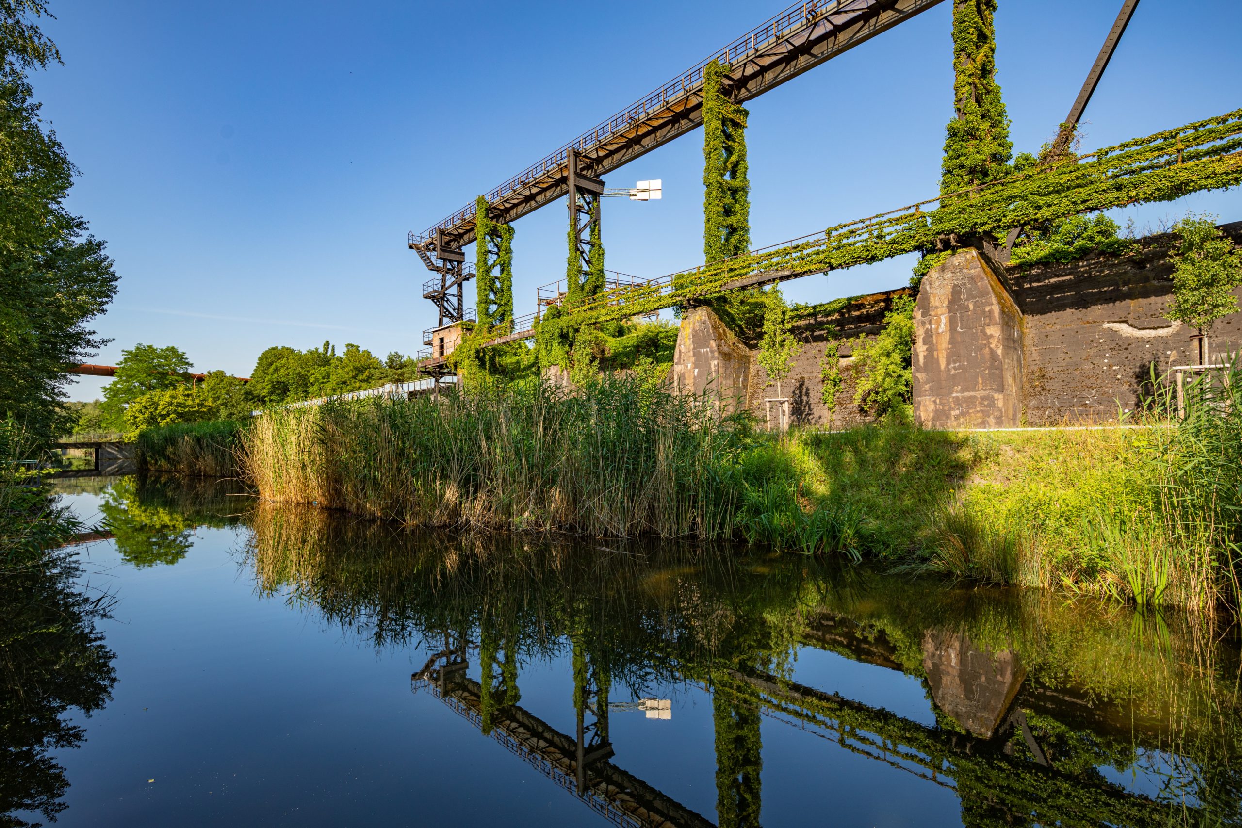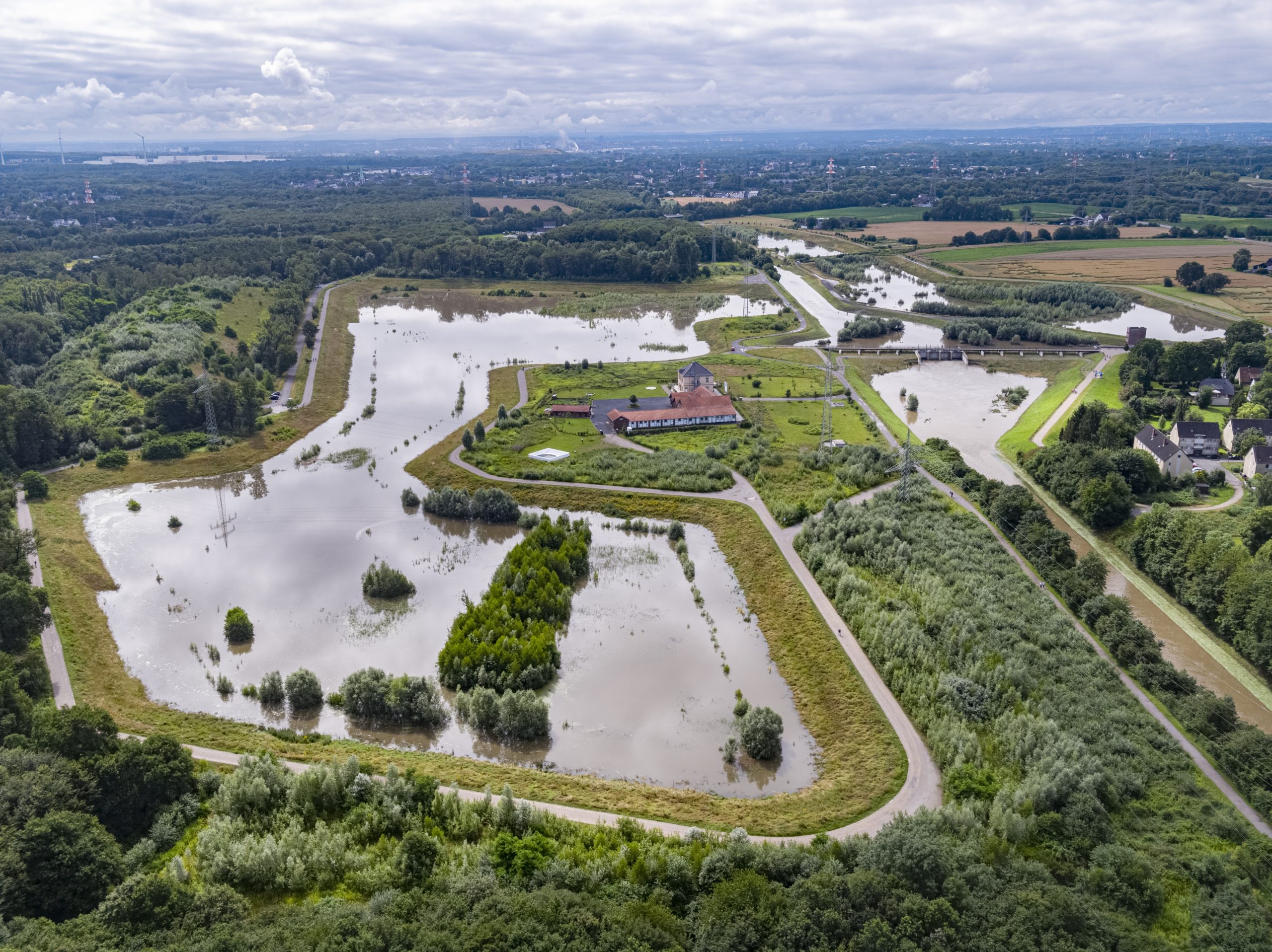 Über dieses Absturzbauwerk mündet aktuell die Emscher in den Rhein. Mit der Fertigstellung des neuen Auenbereichs wird die Emscher-Mündung rund 500 Meter weiter nördlich von Dinslaken nach Voerde verlegt. Damit gewährleistet die Emschergenossenschaft die „Reisefreiheit“ für Fische. Das alte Absturzbauwerk soll als Relikt aus vergangenen Zeiten für zukünftige Generationen erhalten bleiben.