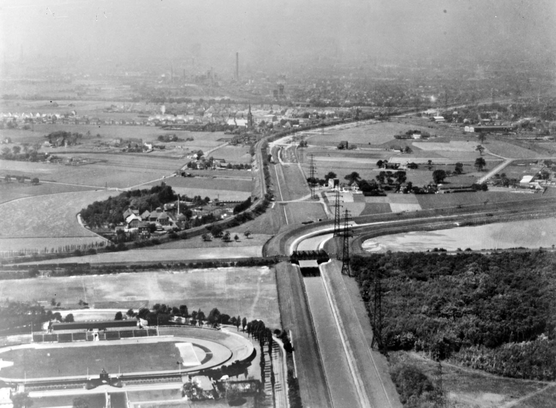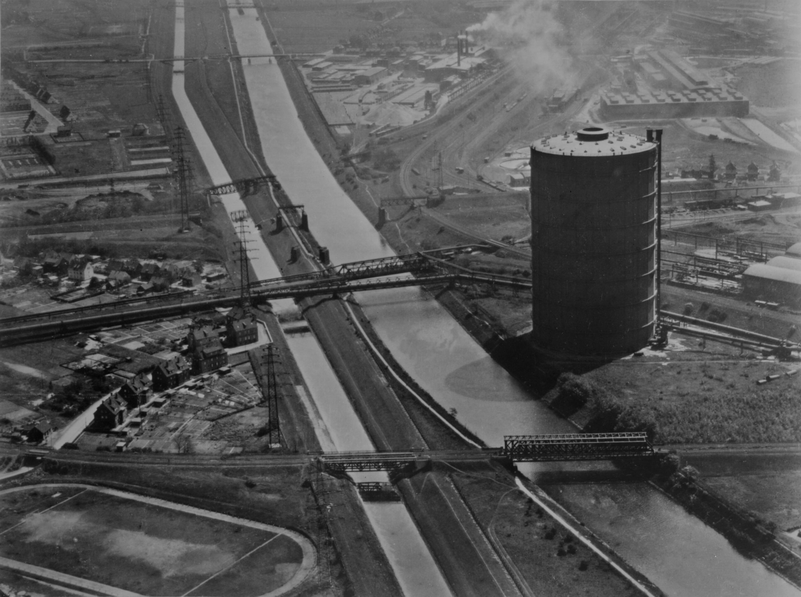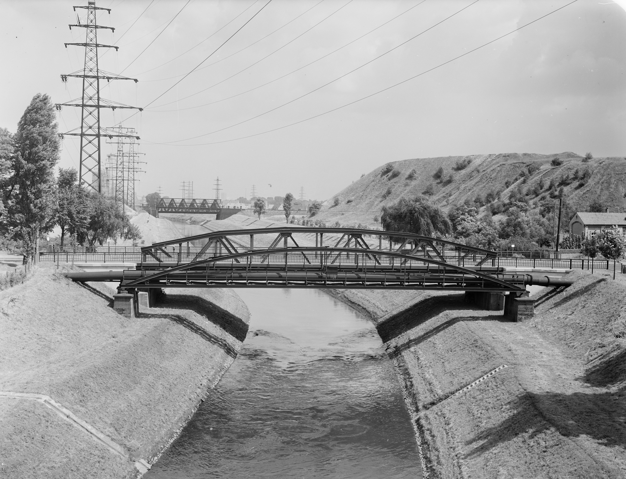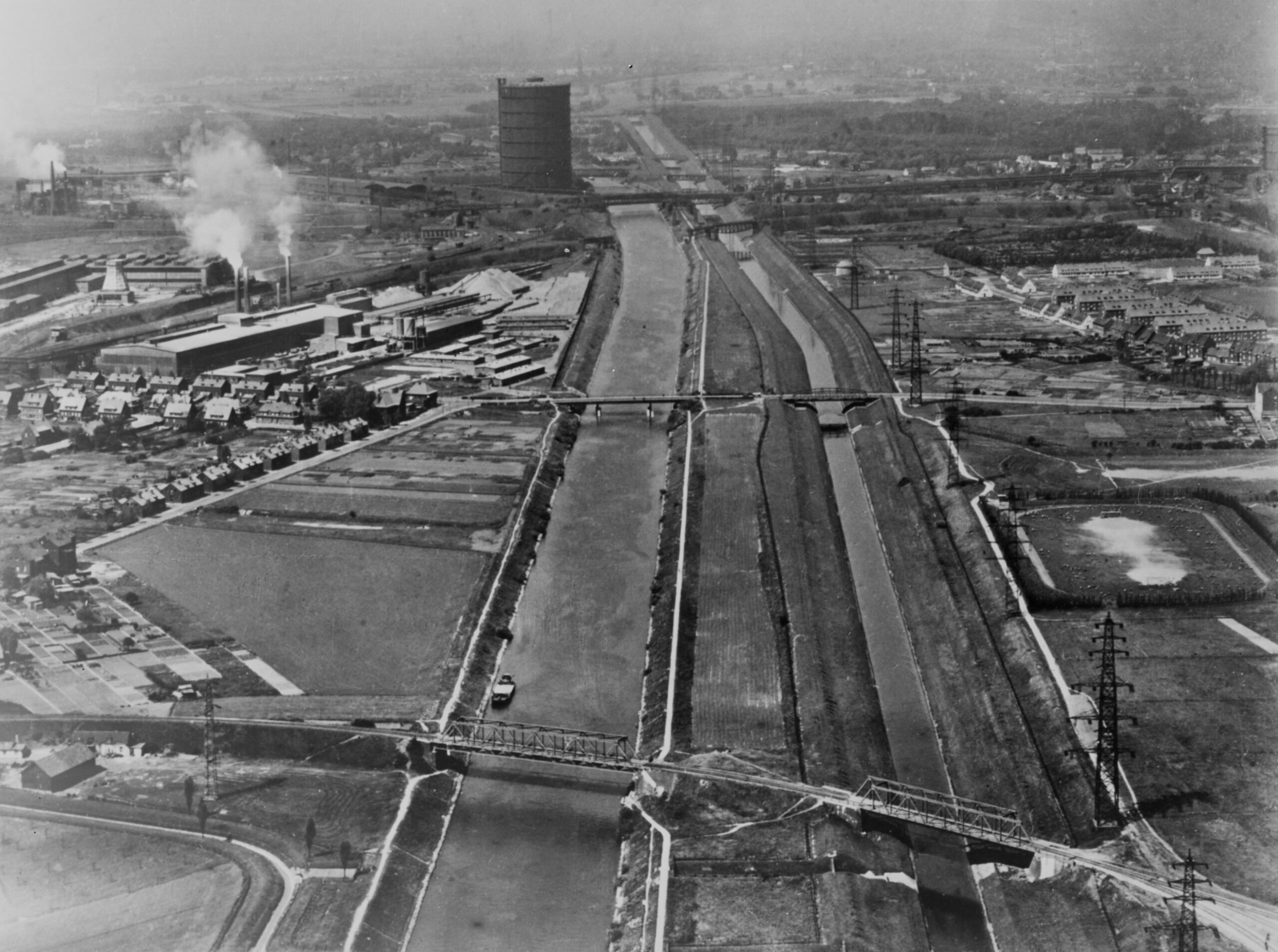 Die Emscher (li.) in Oberhausen im Jahr 1955, rechts fließt der Rhein-Herne-Kanal.