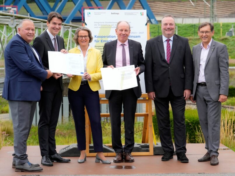Emscher-Gebiet. Ina Scharrenbach, Ministerin für Heimat, Kommunales, Bau und Digitalisierung des Landes Nordrhein-Westfalen hat heute, 1. September 2023, gemeinsam mit Prof. Dr. Uli Paetzel, Vorstandsvorsitzender Wasserwirtschaftsverbände Emschergenossenschaft und Lippeverband (EGLV), und Bernd Tischler, Oberbürgermeister der Stadt Bottrop, stellvertretend für die Emscher- und Lippe-Kommunen, die Kooperationsvereinbarung „Gemeinsam für Emscher und Lippe“ unterzeichnet