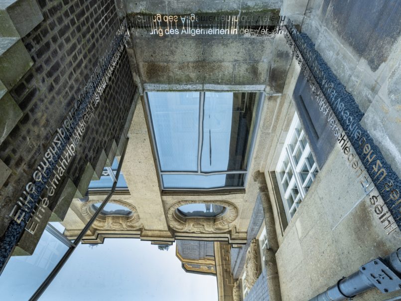 Essen. „Eine emanzipierte Gesellschaft jedoch wäre die Verwirklichung des Allgemeinen in der Versöhnung der Differenzen, ohne Angst verschieden zu sein“ – so lautet der Text, der die Metallfläche rahmt, die nun am Gebäude des Emscher-Hauses, der Hauptverwaltung von EGLV an der Kronprinzenstraße 24 in Essen, installiert wurde. Bei der 210 x 330 x 10 cm großen Edelstahl-Konstruktion, die den Titel "pond of view" trägt, handelt es sich um ein Kunstwerk des Wuppertaler Künstlers Jonas Hohnke (*1983), das EGLV im Rahmen der Aufarbeitung der nationalsozialistischen Geschichte der Verbände in Auftrag gegeben haben.