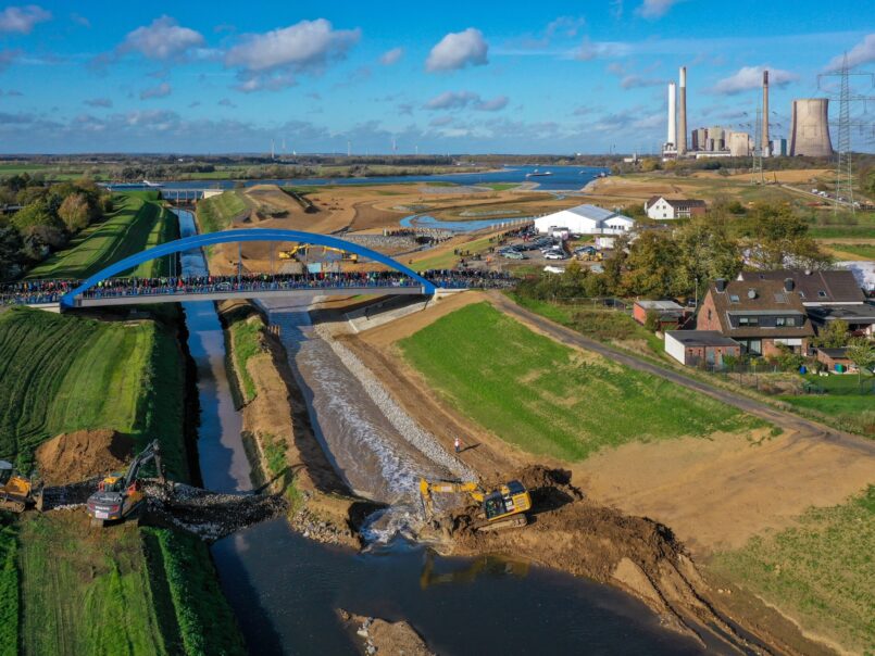 Mit der neuen Emscher-Mündung in den Rhein ermöglicht die Emschergenossenschaft Fischen den Aufstieg stromaufwärts – ein Beitrag zur Steigerung der Artenvielfalt, der über Jahrzehnte nicht möglich war: Seit der Inbetriebnahme des Mündungsbauwerkes im Jahr 1949 stürzte die Emscher rund fünf Meter tief in den Rhein. Mit der Verlegung der Mündung um knapp 500 Meter nach Norden hat die Emschergenossenschaft den Höhenunterschied elegant und sanft ausgeglichen, unter anderem mit fischfreundlichen Sohlgleiten. Rund 70 Millionen Euro hat die Emschergenossenschaft in die Maßnahme investiert – es ist eine sinnvolle Investition in die Klimafolgenanpassung, in den Hochwasserschutz und in die Förderung der Artenvielfalt im neuen Emscher-System.