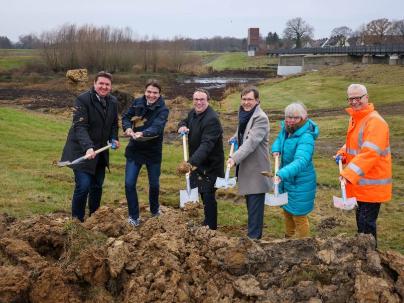 Die Emscher-Auen in Castrop-Rauxel und Dortmund sorgen für Hochwassersicherheit, nun wird das Rückhaltebecken sogar noch weiter ausgebaut – NRW-Umweltminister Oliver Krischer setzte dafür am Montag (19.12.) den ersten Spatenstich