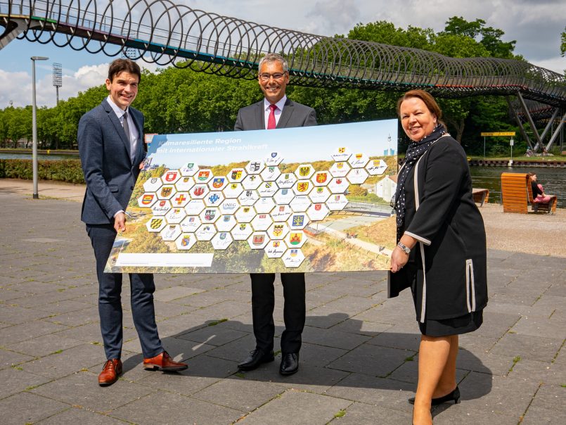 Als deutliches Bekenntnis zur Klimafolgenanpassung unterzeichneten NRW-Umweltministerin Ursula Heinen-Esser und die Vorstandsvorsitzenden der großen Wasserwirtschaftsverbände Emschergenossenschaft, Lippeverband und Ruhrverband – Prof. Dr. Uli Paetzel und Prof. Dr. Norbert Jardin – nun in Oberhausen eine symbolische Erklärung. Alle Städte der Region werden auf dieser Erklärung vertreten sein, sowohl die kreisfreien Städte Bochum, Bottrop, Dortmund, Duisburg, Essen, Gelsenkirchen, Hagen, Hamm, Herne, Mülheim an der Ruhr und Oberhausen als auch die Kreise Ennepe-Ruhr, Recklinghausen, Unna und Wesel. Neben der Emschergenossenschaft als federführender Wasserwirtschaftsverband sind darüber hinaus nun auch der Lippeverband, der Ruhrverband, die Linksniederrheinische Entwässerungs-Genossenschaft und der Niersverband dabei.