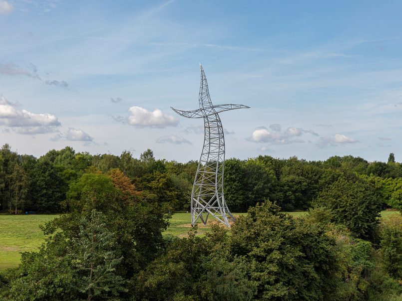 Im Anschluss erfolgt die offizielle Übergabe des Kunstwerks von der Emschergenossenschaft an den Regionalverband Ruhr. Im Künstler-Talk um 14 Uhr spricht Kuratorin Marijke Lukowicz von Urbane Künste Ruhr mit Thomas Schmidt vom Künstlerkollektiv Inges Idee über die Entstehungsgeschichte der Arbeit. Das Kunstwerk wurde im Rahmen der zweiten Emscherkunst-Ausstellung 2013 realisiert und 2018 aufgrund statischer Mängel abgebaut. Kürzlich erhielt die 35 Meter hohe Neukonstruktion ihren finalen Anstrich und ist nun wieder als Landmarke weithin sichtbar.