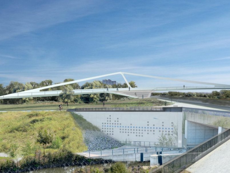 Beim Gang über die neue von DKFS Architects aus London entworfene Brücke können Spazierende und Radfahrende künftig nicht nur den Rhein-Herne-Kanal, sondern zusätzlich auch zweimal die Emscher überqueren. Im Sommer 2022 werden die Bauarbeiten zum „Sprung über die Emscher“ voraussichtlich fertiggestellt – bis dahin verbaut die Emschergenossenschaft etwa 900 Tonnen Stahl für das Brückenbauwerk. 412 Meter lang wird die stählerne Zügelgurtbrücke einmal sein und in doppelter S-Form über das Wasserkreuz führen.