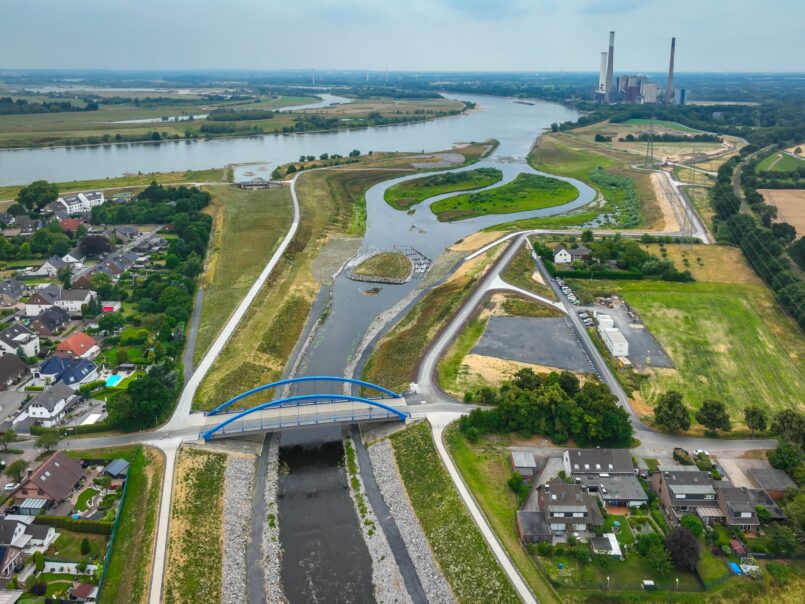 Gestern graues Absturzbauwerk, heute lebendiges Mündungsdelta: Mit der Verlegung der Mündung der Emscher in den Rhein um etwa 500 Meter nach Norden schuf die Emschergenossenschaft genug Platz für eine naturnahe Umgestaltung des Areals. Über zehn Jahre hinweg verwandelte die Emschergenossenschaft die letzten Meter des einst begradigten Abwasserflusses in ein weitläufiges Naturidyll. Die Renaturierungsarbeiten wurden im Sommer 2025 abgeschlossen. Im und am Wasser siedeln sich wieder Tiere und Pflanzen in den neu entstandenen Lebensräumen an.