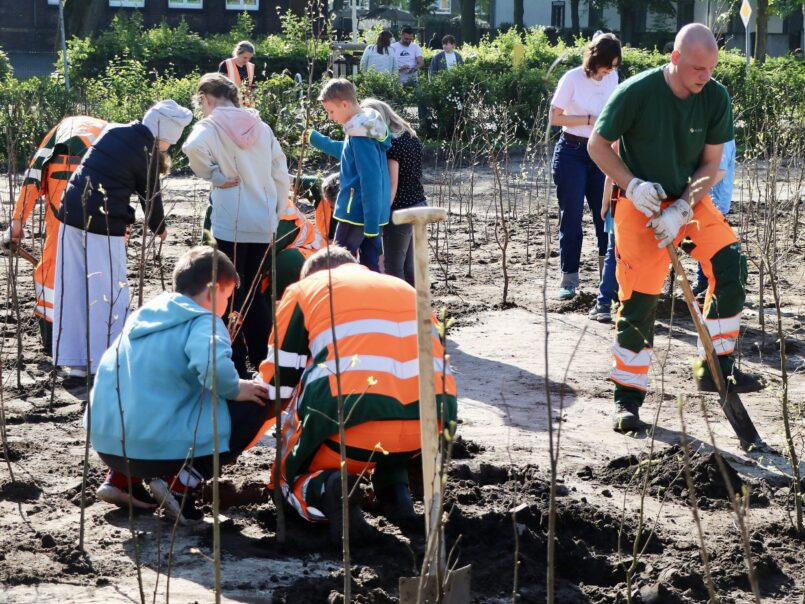 Eine große Unterstützung bei der Pflanzaktion waren die Kinder der benachbarten Grundschule Hochlarmark, die mithalfen, ihr eigenes grünes Klassenzimmer zu erschaffen, das als Lern- und Begegnungsort dienen soll.