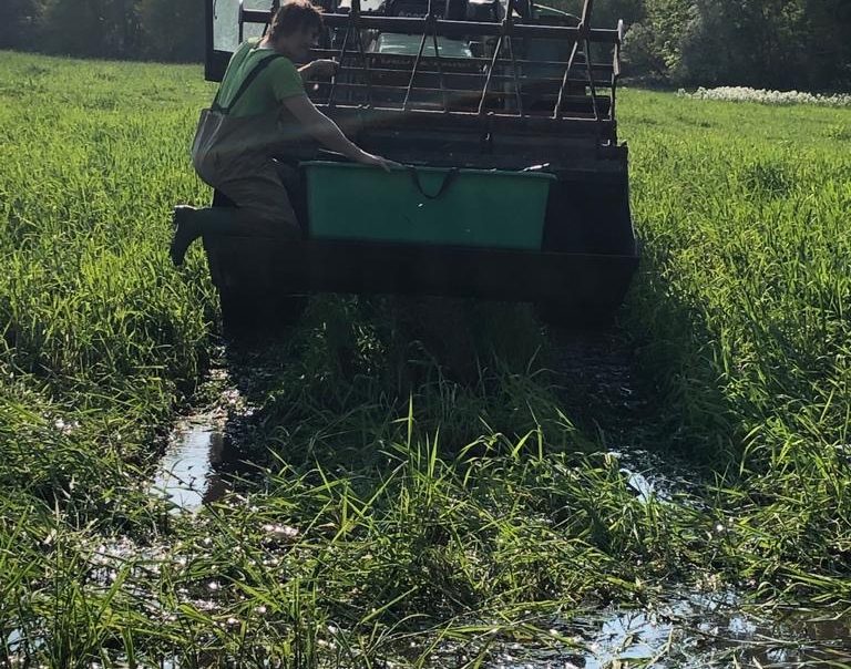 Ausgestattet mit Keschern retteten Vereinsmitglied Malte Micus und seine Kollegen Eric und Davin Kruse 30 größere Fische und setzten sie zurück in die Lippe. Auch Landwirt Benedikt Belustedde half vor Ort und fuhr mit dem Trecker die schweren Wasserwannen mit den befreiten Fischen zum Fluss.